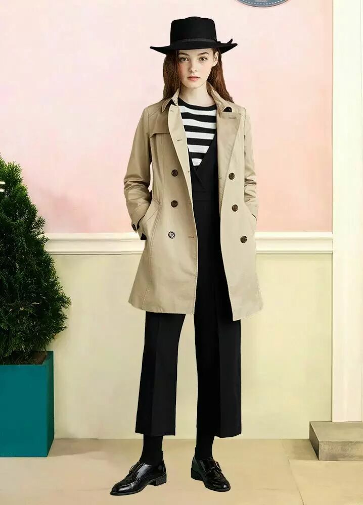 经典款风衣, 沿袭双排扣的传统设计; 挺括的面料带来特殊的高雅质感, 流露出贵族式少女清纯气质。 在秋日的街头, 更显清纯无害,让人亲近。