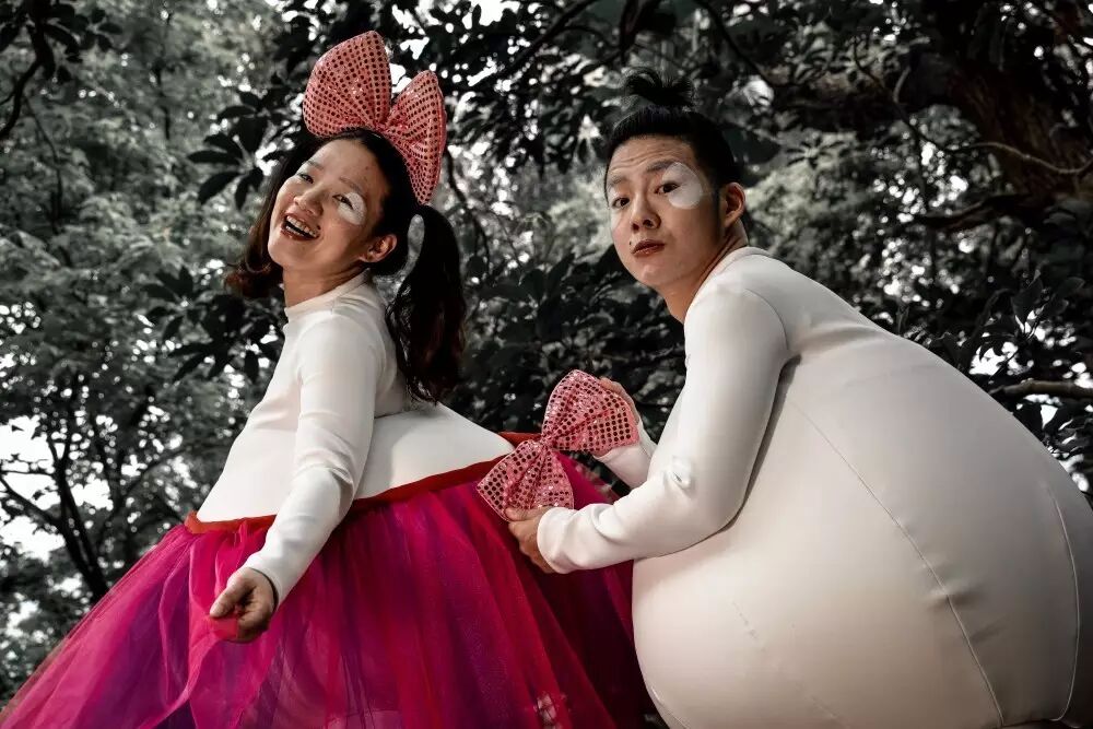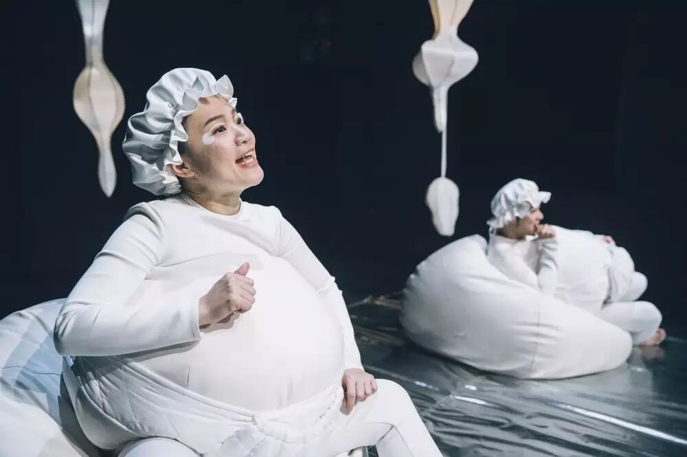 剧中的两个演员穿着肥大的外套,装扮成婴儿的样子,哥哥一直都没有太多的变化,而妹妹却因为成长而换上不同年龄的衣服,不过两位都始终保持着肥大的样子。就如同是两个婴儿之间的对话一般,即便时间在向前,可是他们的身形始终提醒着观众,他们最初的样子。外加整个舞台也是一个类似于子宫或者母体之类的空间,也同样预示着我们最初来到的地方。