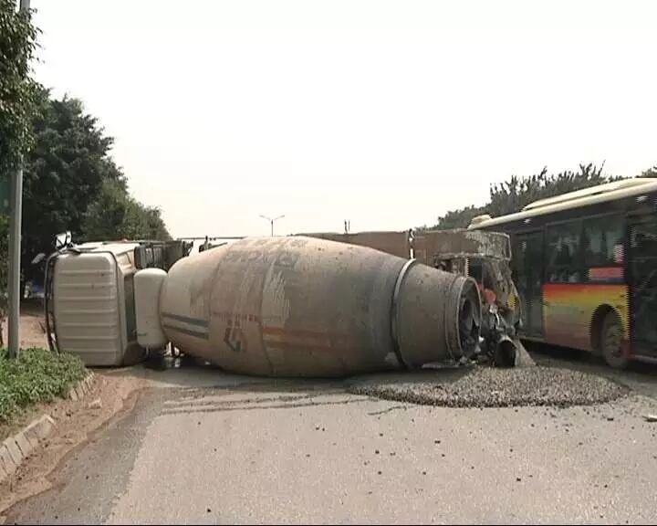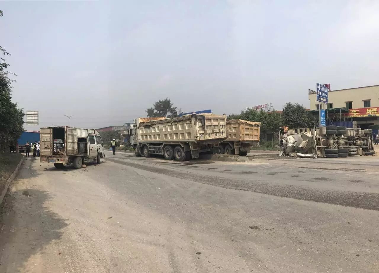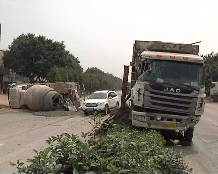 今天上午,321国道鼎湖依坑村附近路段发生连环车祸,记者在事故现场看到,一辆水泥搅拌车侧翻在路边,一辆泥头车冲上了花基,马路对面还有一辆小货车,逆向停在路边,车头撞变形,前挡风玻璃上满是裂痕。