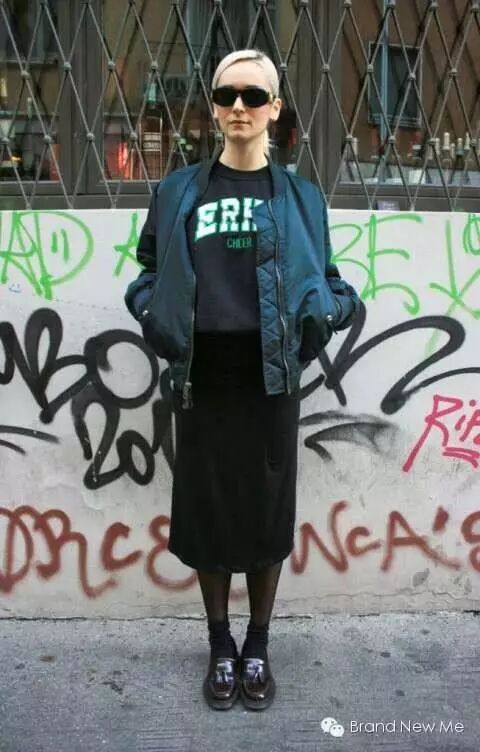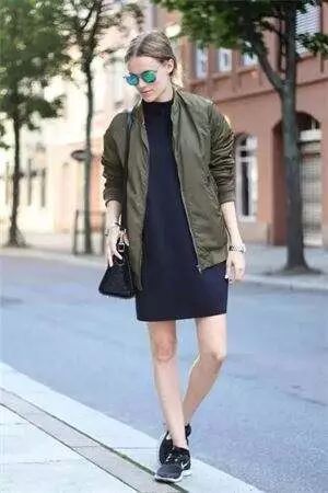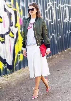 没想到吧,这种空军夹克搭配裙子来穿也是相当帅气的哦~