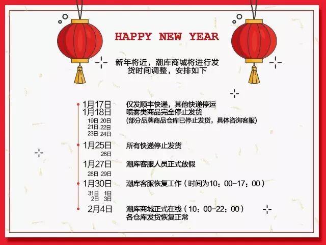潮库商城春节期间安排如下,各位需要购物的小伙伴们注意了哦