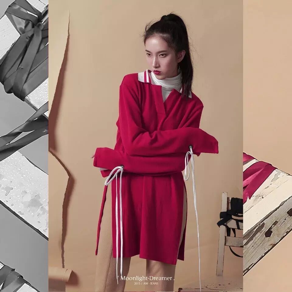 推荐理由:开叉系带针织衫,手袖的长绳设计,非常有独特的魅力,时尚十足。
