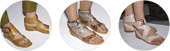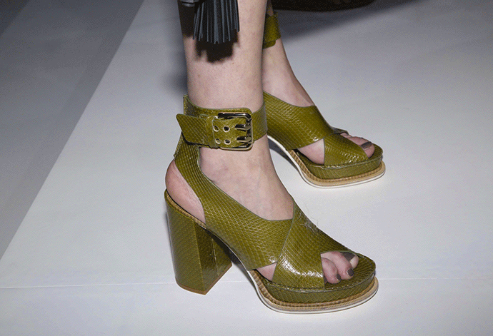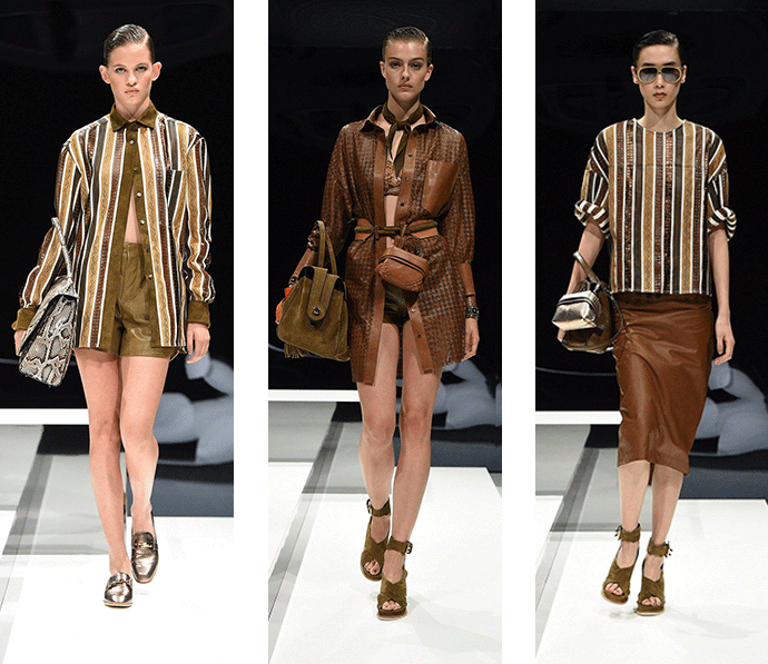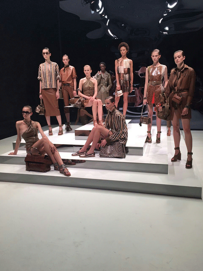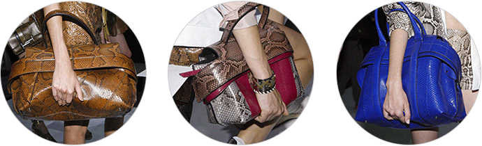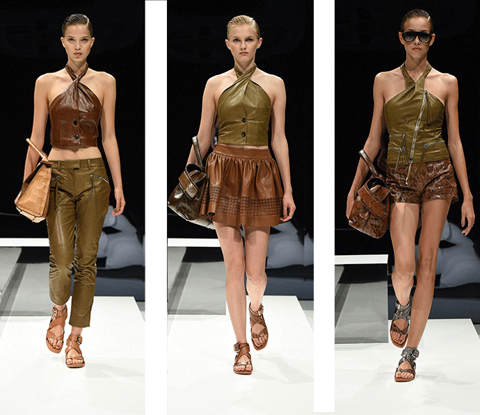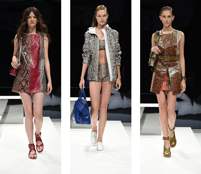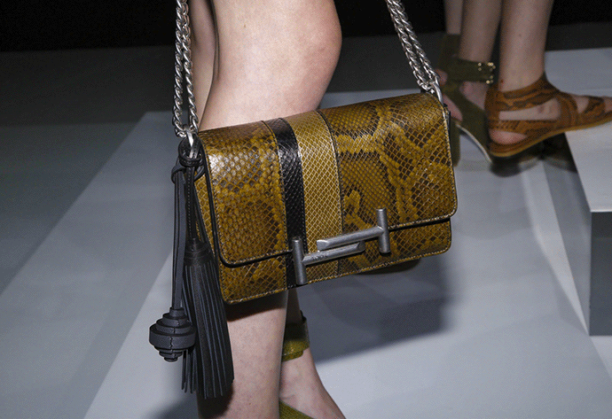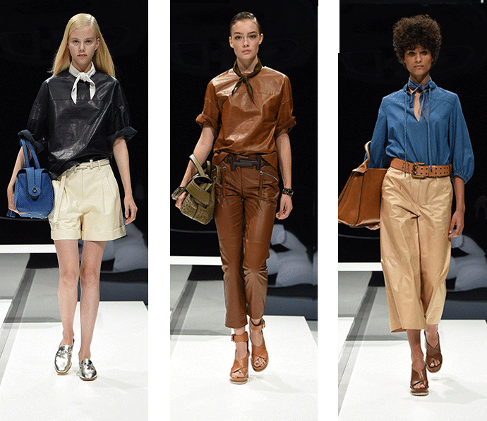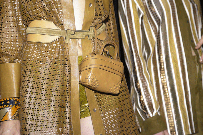 皮质材料在我们印象中一直是厚重、不呼吸、硬挺的形象,唯有秋冬时节我们才会穿着。但是 Tod's 的春夏女装不管是在设计上还是皮质的开发上都带给了我们新的视觉和触感。条纹的蟒蛇皮革在经过面料的改造以后,变得轻薄透气,如果从远处看,你还会发现这是皮革吗?