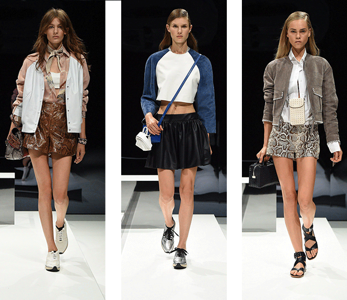 用皮革如何去表现运动风,我想没有谁比 Tod's 更有发言权。它对于这种材质的掌握和运用,早已经达到了炉火纯青的境地。大块的低纯度拼色,宽松的蟒蛇皮高腰短裤,这是它结合当下时尚所呈现给我们的视角。毋庸置疑 Tod's 是具有意大利的优雅和性感,但是我们也不难从 2017 年的春夏女装里看出它随性慵懒的野性之风。