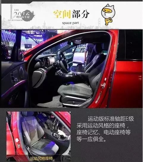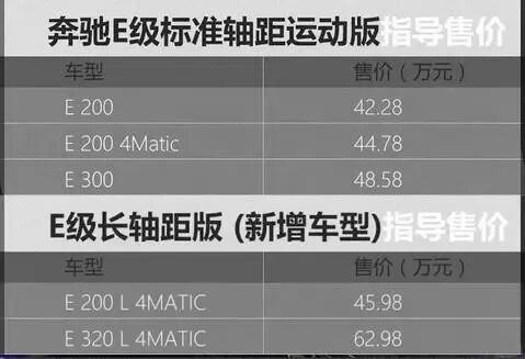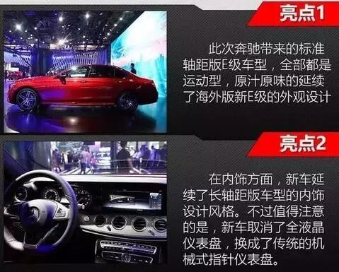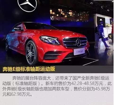 2016广州国际车展,奔驰带来了国产全新奔驰E级运动版(标准轴距版)。新车的售价为42.28-48.58万元,此外奔驰E级长轴距版也增加两款车型,售价分别为45.98万元和62.98万元。