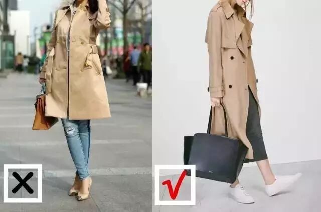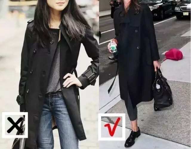 首先注意,短款风衣不要系腰带--不但显得小里小气,也很难对付下身的搭配