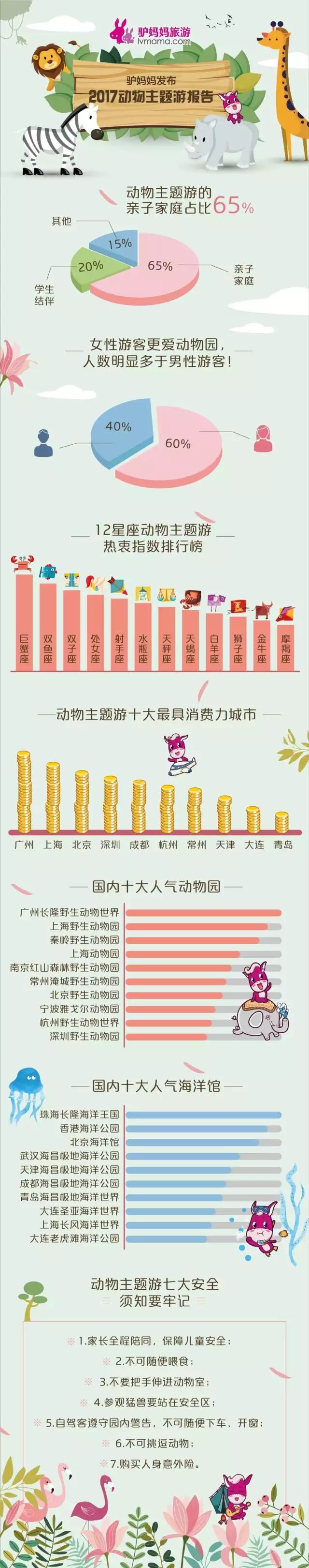 近来野生动物园旅游安全事件频发,也让“动物主题游”成为人们关注的焦点。日前,国内自助游领军品牌驴妈妈旅游网发布的《2017动物主题游报告》(以下简称《报告》)显示,在喜爱动物主题游的人群中,家庭亲子游客占比65%,其次是年轻游客,广东、上海、北京等城市动物主题游消费力最强。四月是动物主题游的高峰,广州长隆野生动物世界、上海野生动物园、珠海长隆海洋王国成为国内最受欢迎的动物主题类景区。对于游玩中存在的潜在风险,仅有10%的游客会在购买动物主题游景区门票时添购意外险。