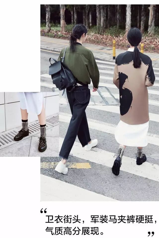 卫衣街头,军装马夹裤硬挺,本是风格迥异的单品出现在同一个LOOK中,整体颜色和谐舒适,都带有一丝丝威风凛凛气质高分展现。