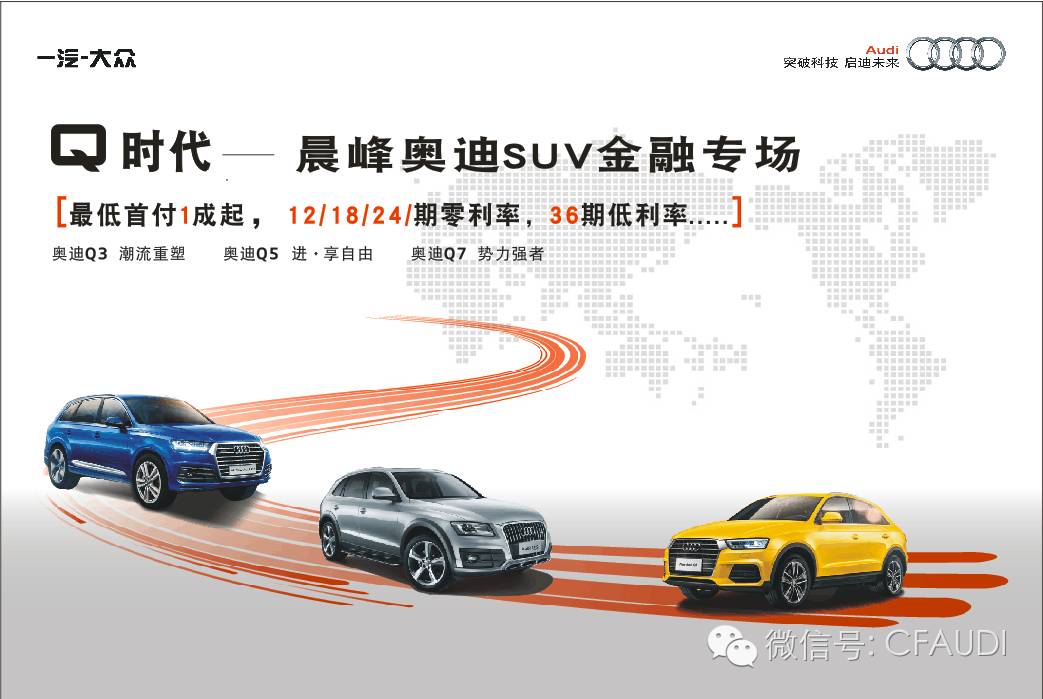 即日起至7月24日,至广州晨峰奥迪购车畅享奥迪Q系指定车型、超值精品装潢等奢华礼遇。为您量身定制奥迪“Q”系专场,豪华SUV领军者,奥迪Q3/Q5/Q7现车供应,限时特供,进享都市SUV,暂别城市喧嚣,尽享愉悦生活!