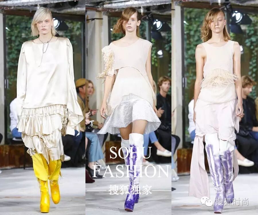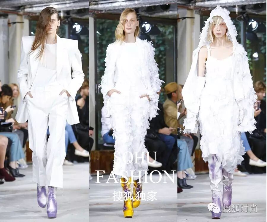 此外,设计师十分注重细节处理,好比兜口对称的直筒工装裤、间隔拼接材质不一的布条、布满衣身的毛边苏穗,甚至连侧缝也做浪边处理。纯洁的天使都有欲望,那Mashama的叛逆酷劲里也存有一丝轻逸的女性柔美,而垫高的肩部则更显Mashama女性的硬朗帅气,气如长虹。