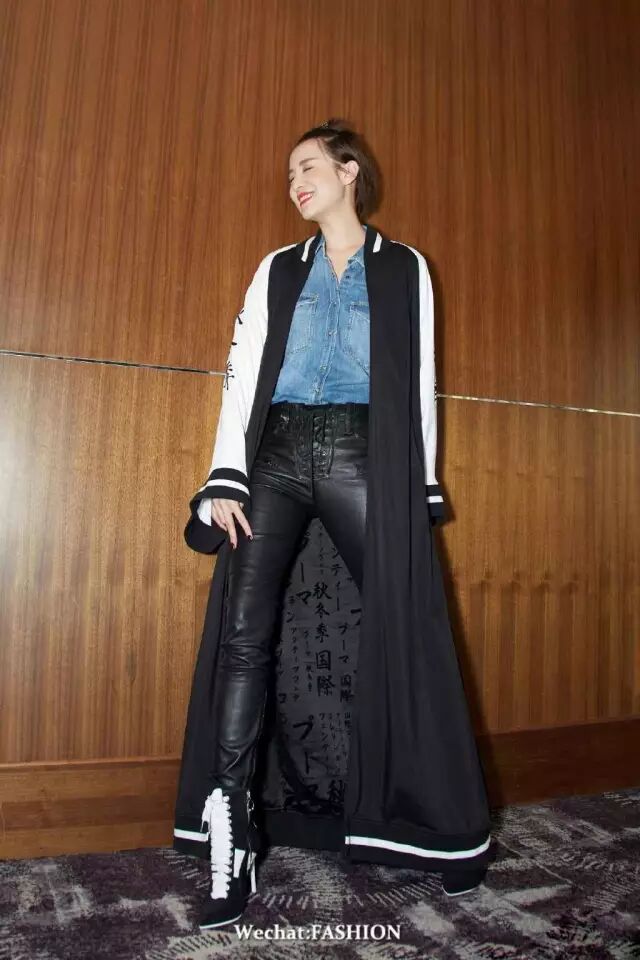 宋佳穿超长款运动风外套配牛仔衬衫,下身用皮裤配绑带短靴,帅翻了。