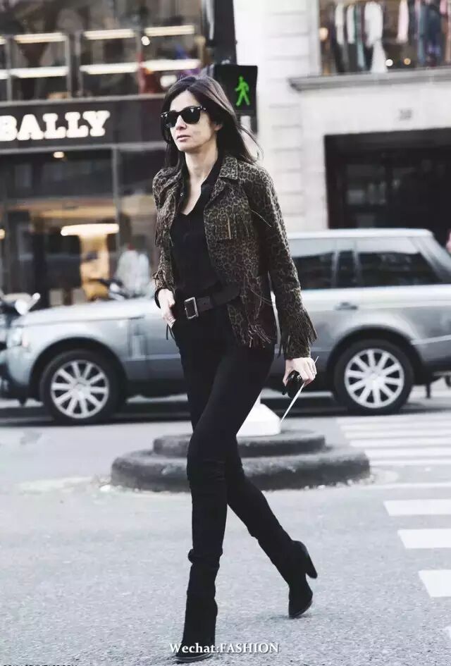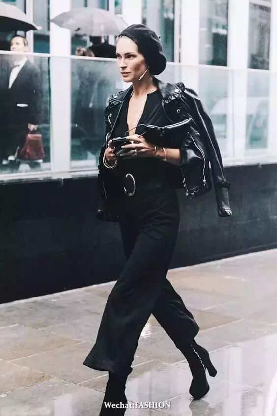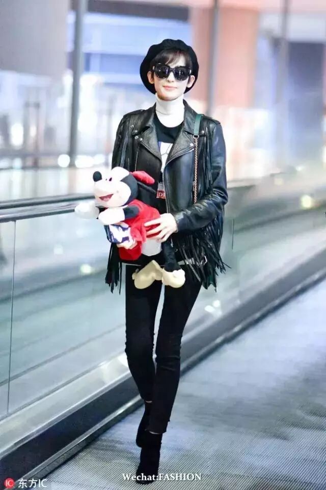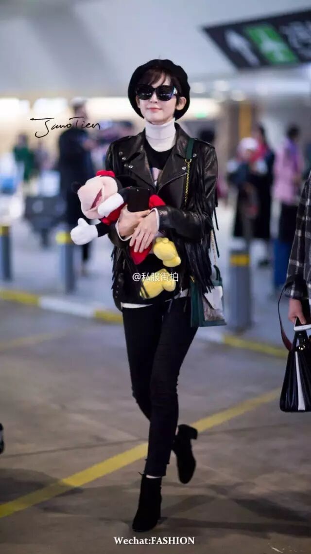 古力娜扎穿上古驰 (Gucci) 流苏机车夹克内搭圣罗兰 (Saint Laurent) 鲨鱼印花Tee,下身用黑色极深刻配短靴,变身Rock少女,但头上的黑色贝雷帽把摇滚的狂野收敛在了复古的甜美之中,这样的化学反应挺美妙!