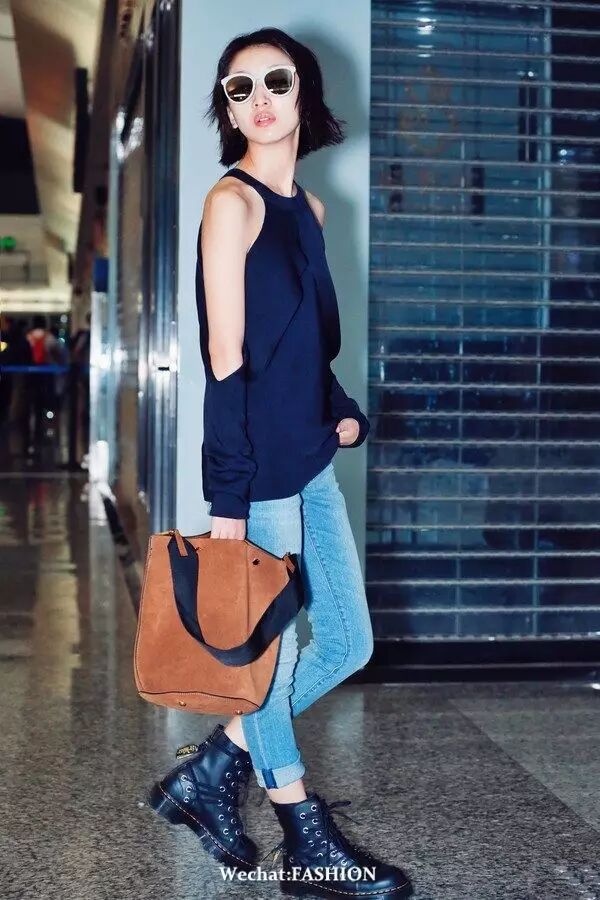 露肩上衣配牛仔紧身裤,卷起裤脚配一双铆钉马丁靴,显腿长的小心机学起来。