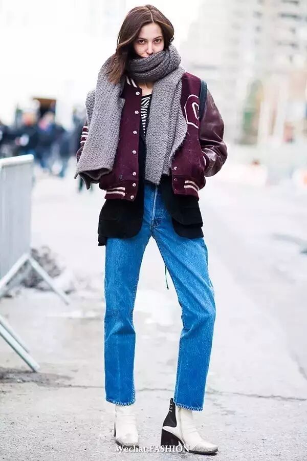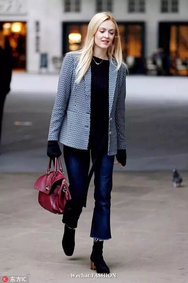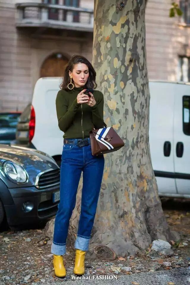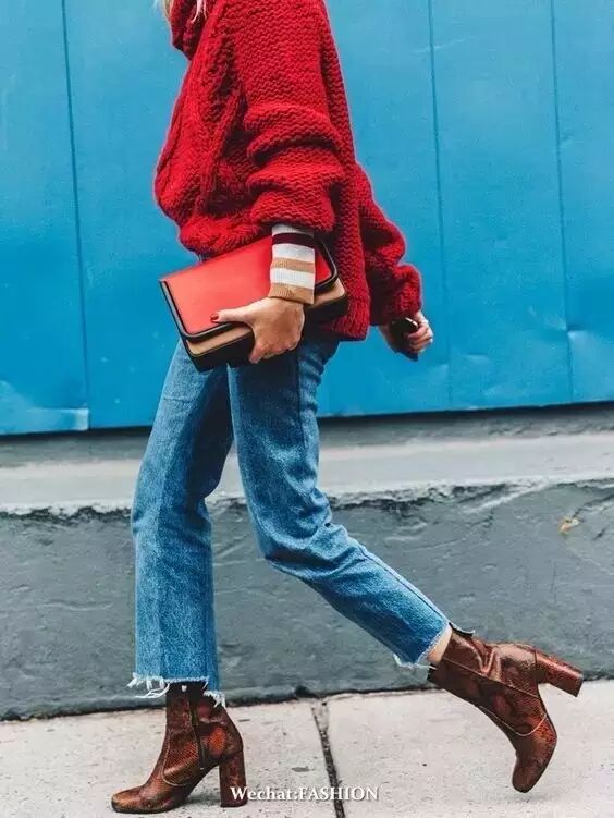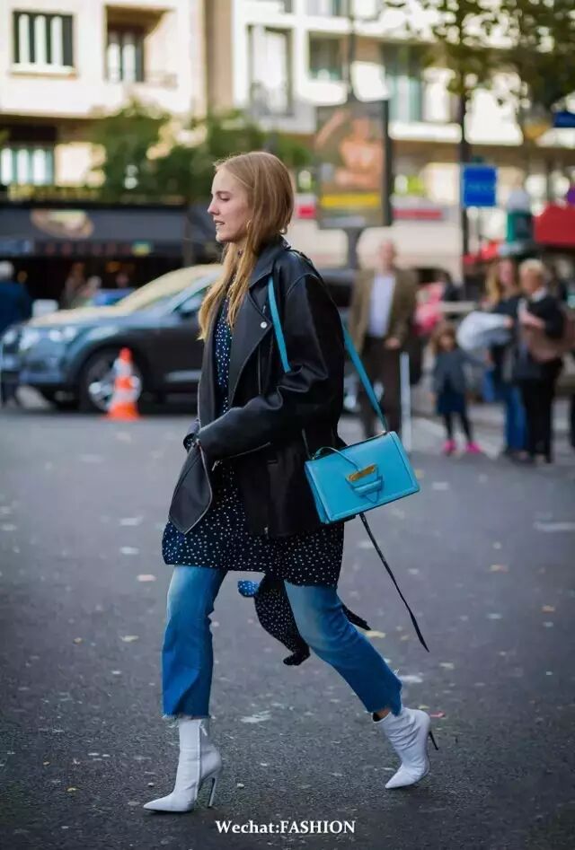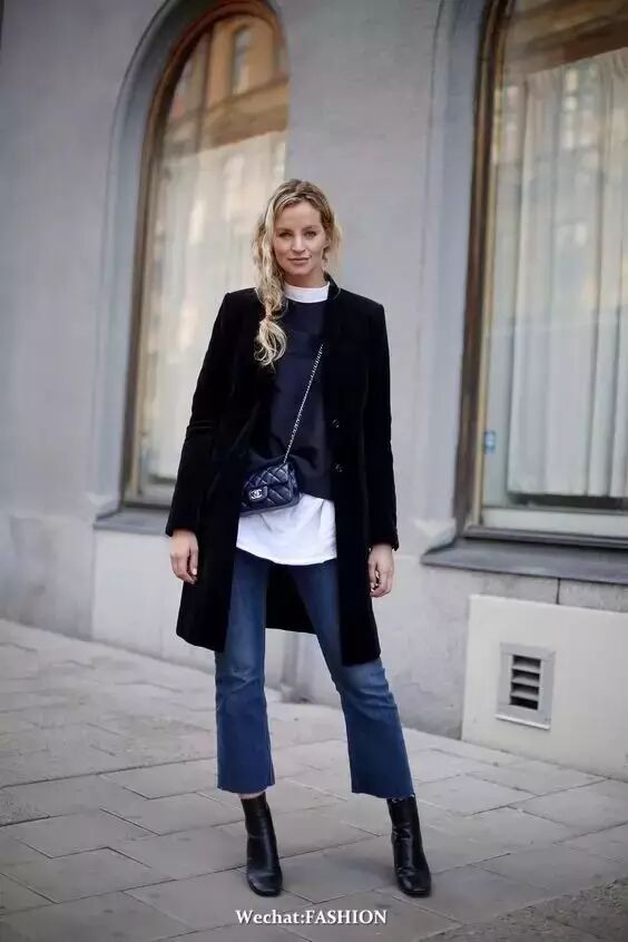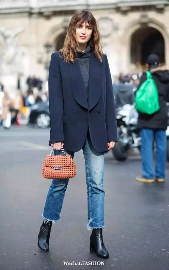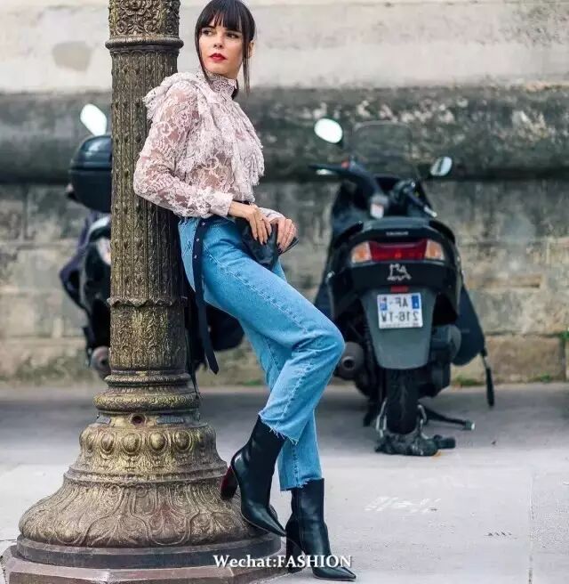今年流行的下摆有些毛糙小流苏的直筒牛仔裤,跟短靴是绝配。