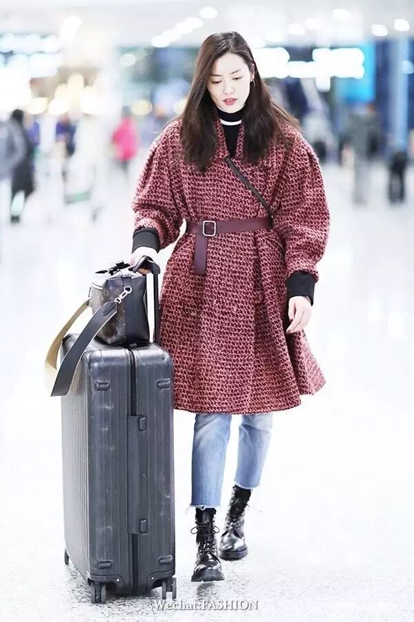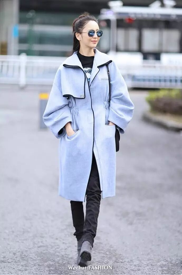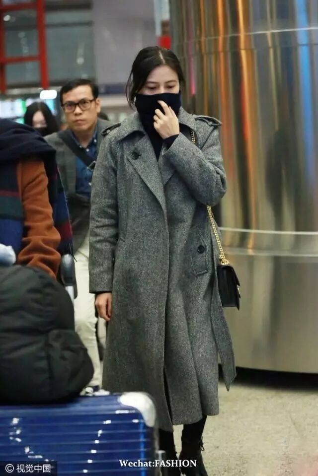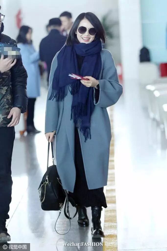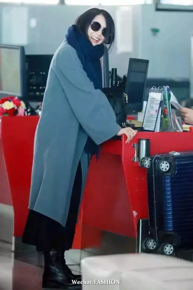 高圆圆在机场穿了件雾霾蓝色大衣,下身用黑色长裙配短靴,配上深蓝色围巾,同类色系深浅错开搭配的方式值得借鉴。