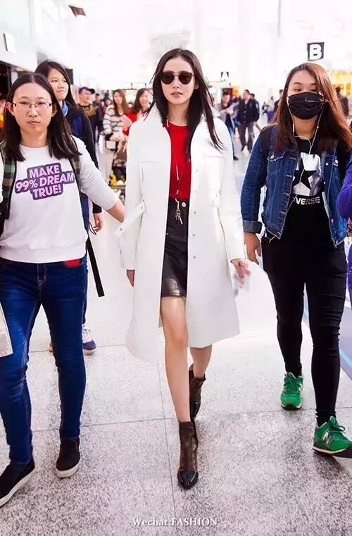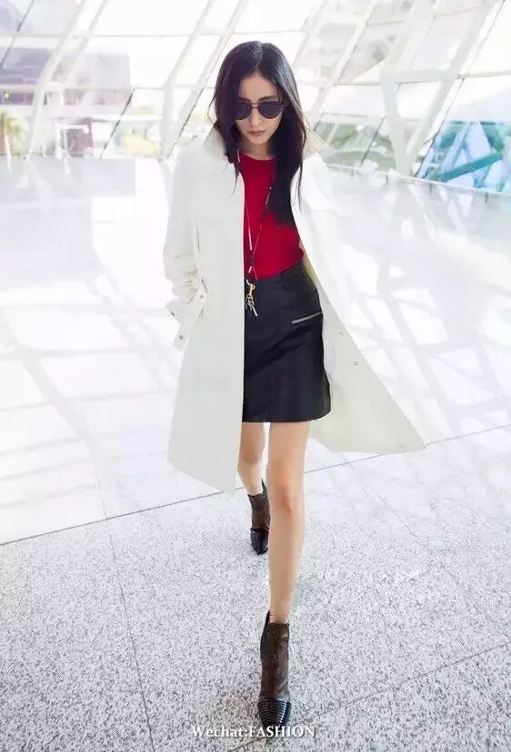 张天爱以一袭白色风衣搭配短靴亮相,干净而充满灵气。外套里面红色毛衣配皮裙增添一抹色彩,脚踩尖头踝靴,露出修长美腿十分抢镜。