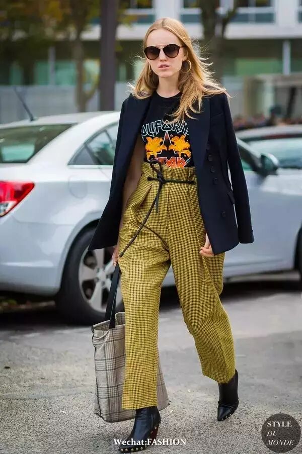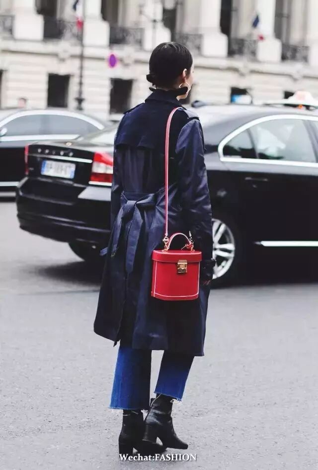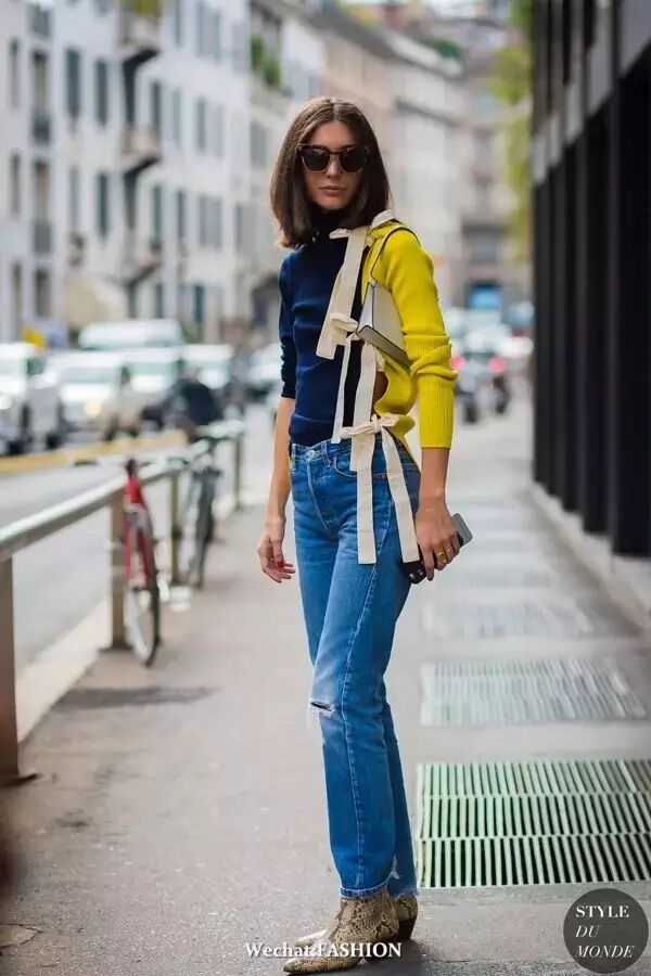 和其他裤型相比,直筒裤的贴近靴口的裤脚使得裤长变得跟更为重要。穿直筒裤最需要谨记卷裤边和露小腿这两个黄金法则。