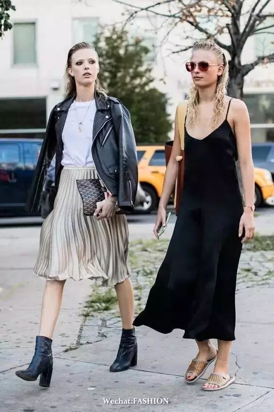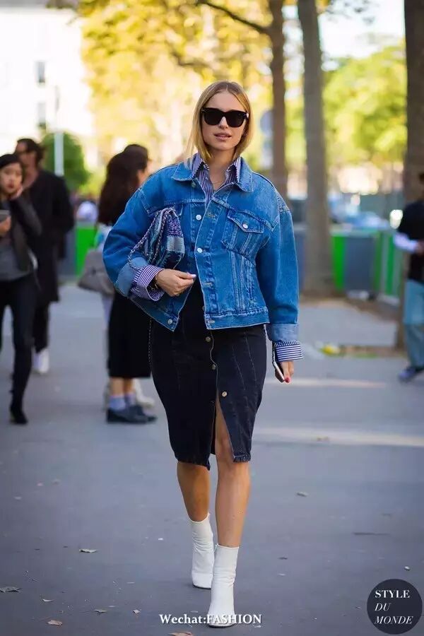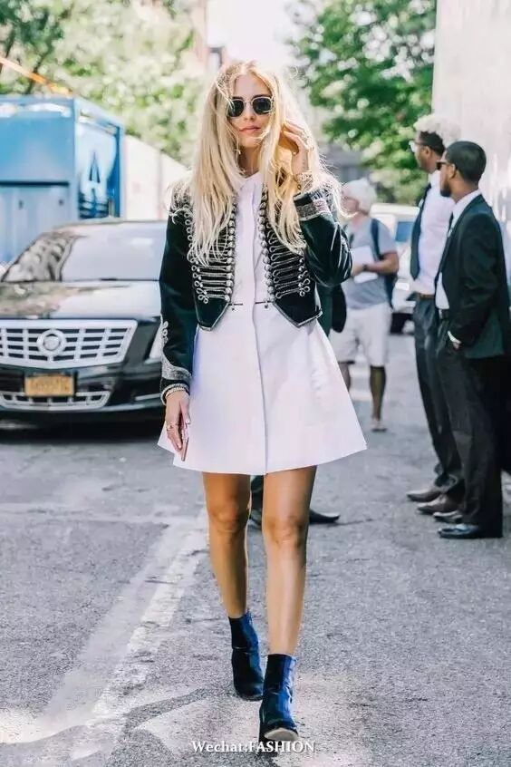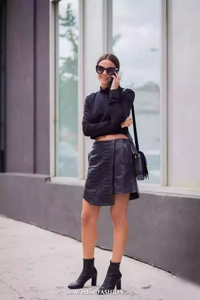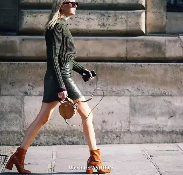 相比于能修饰腿型的裤子,短靴搭短裙会显得更有女人味。而穿上短裙就意味着会露出整个靴面,这时就更加考验我们的搭配功力。紧口靴或靴袜会包住整个脚踝,如果你对你的身材不够自信,选择宽口靴会在视觉上和小腿形成对比,营造骨感的双腿。