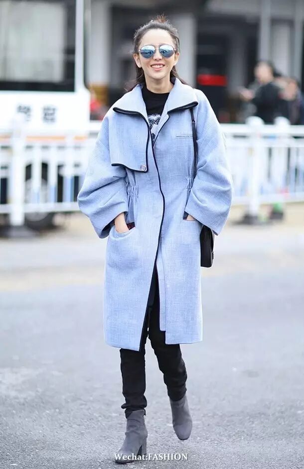 佟丽娅穿Dior 2017早春度假系列淡蓝色大衣让人眼前一亮,经典收腰廓形与黑色线条的碰撞大气利落,下身用简单的黑色裤配粗跟短靴,在新年伊始带来春日气息。