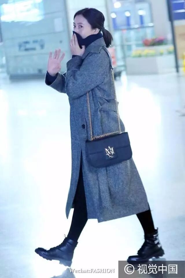 圆圆酷爱极简风,灰色的长大衣配黑色高领毛衣,下身用leggings配短靴,简单时髦。