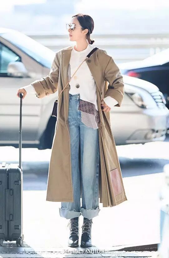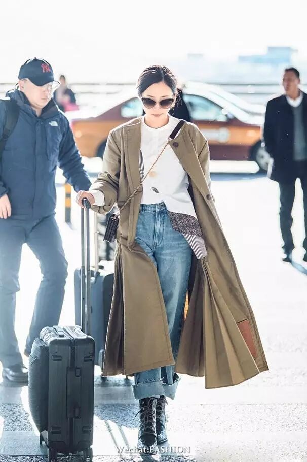 江一燕驼色长款风衣搭配卷边牛仔裤,系带靴增加帅气感。简约的look有了白衬衫上的拼接印花点缀,更吸睛。