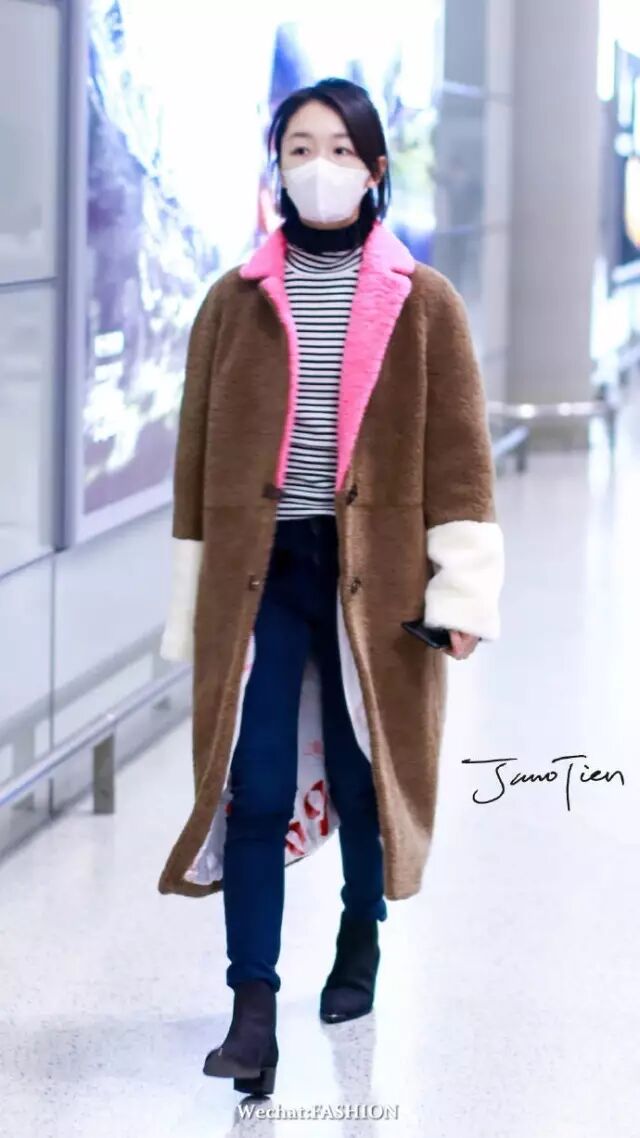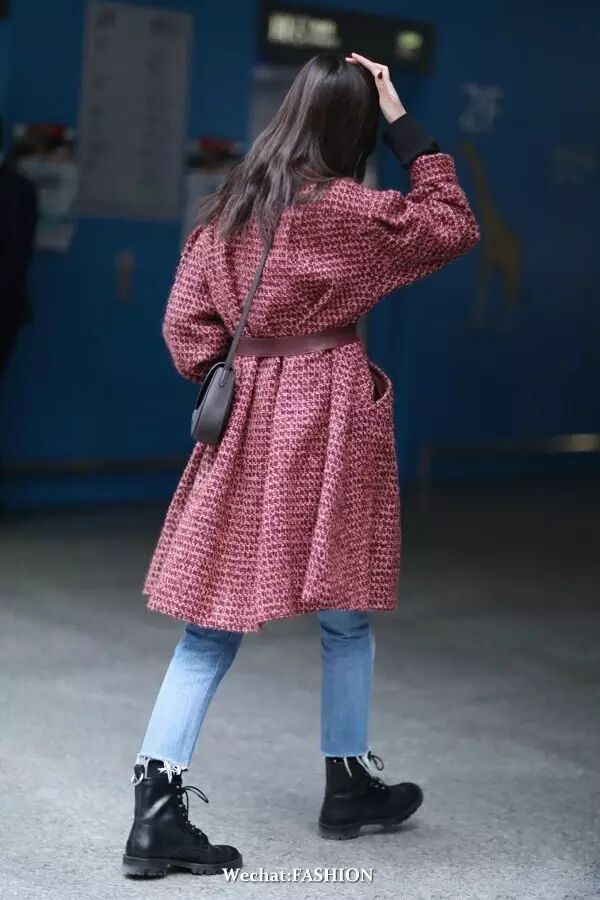 周冬雨在去年的衣品可谓成长的相当迅速,虽说身材条件不算卓越,但穿出了自己独特的风格。这身Saks Potts大衣,搭配条纹衫和牛仔裤加尖头短靴,休闲随性。