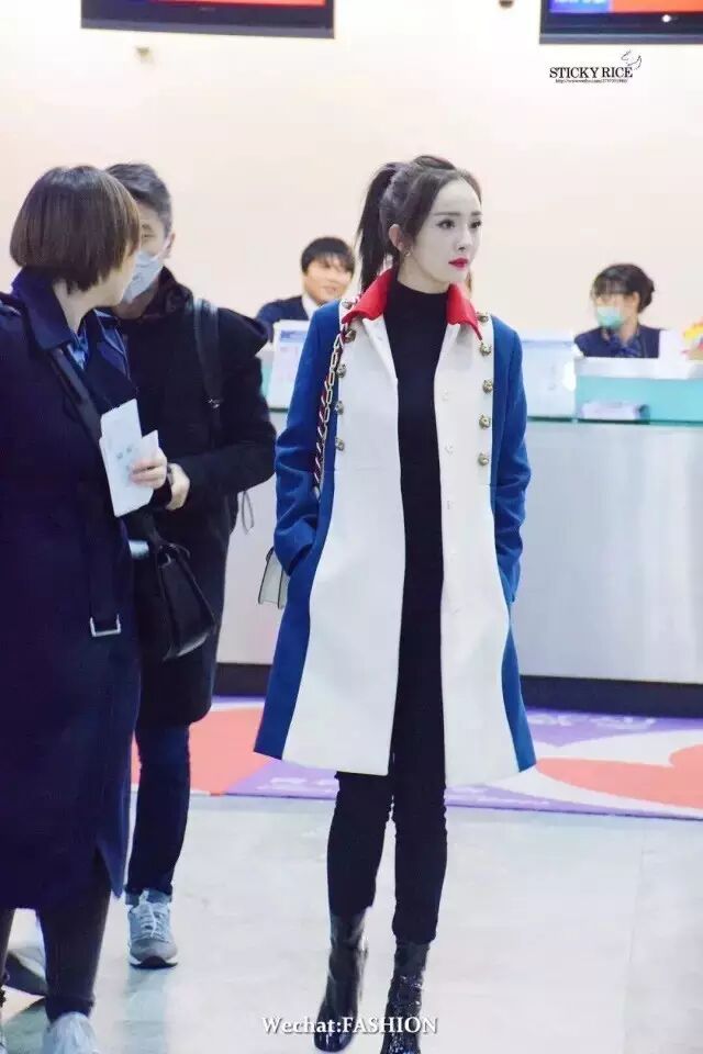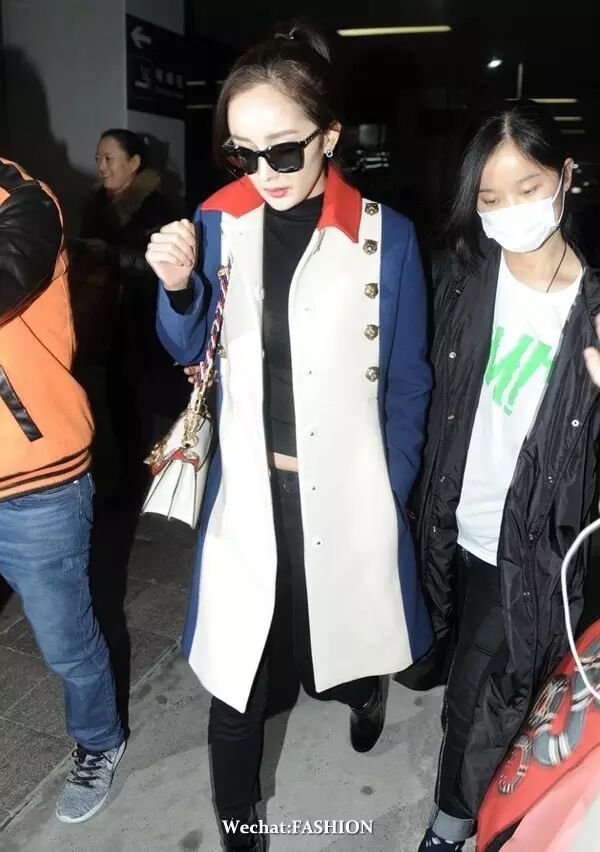 杨幂现身上海机场,她身穿一件Gucci军装感的拼色大衣,红蓝的撞色十分醒目,下身用黑色紧身裤配黑色短靴,让双腿看起来又长又细,高高扎起的马尾也很有青春感。