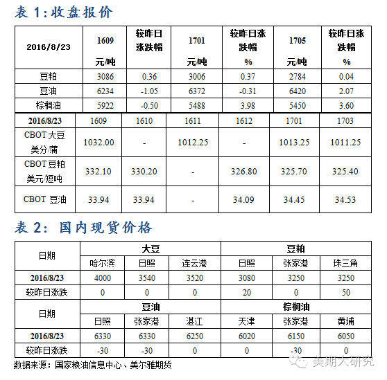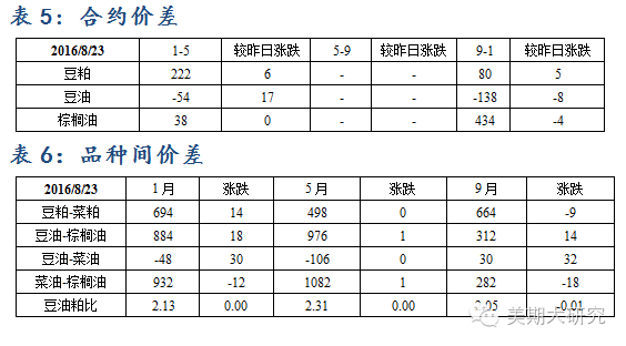 4、 8月23日,国内豆粕成交较淡,成交总量5.1万吨,昨成12.52万吨。国内棕油成交400吨,昨成交1100吨。截止8月22日棕油港口库存为30.78万吨。豆油成交1.7万吨,昨成2.4万吨。截止8月23日,国内豆油商业库存总量117.85万吨,昨日117.74万吨。