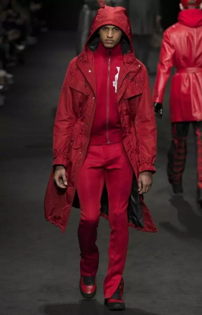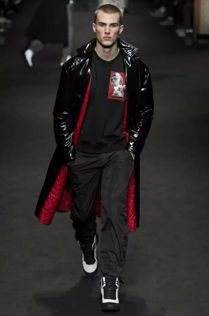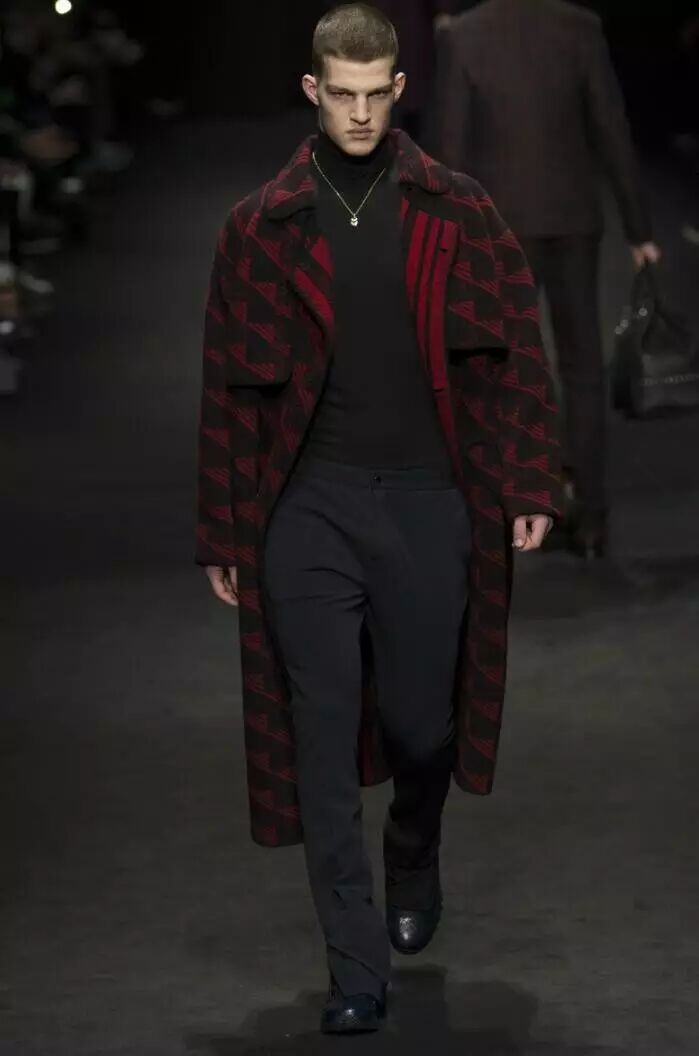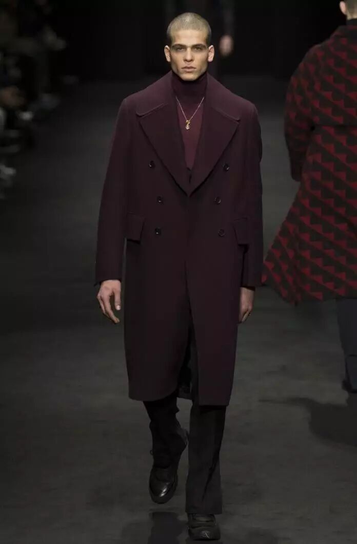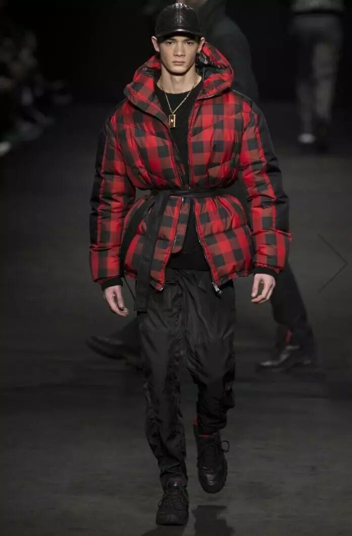 在Versace 2017秋冬男装系列的设计中,设计师将红与黑相撞,形成格纹的图案,应用到男装的衬衫、长款呢子外套、羽绒服等多种款式当中。