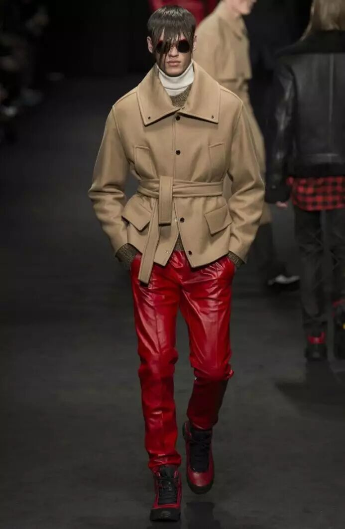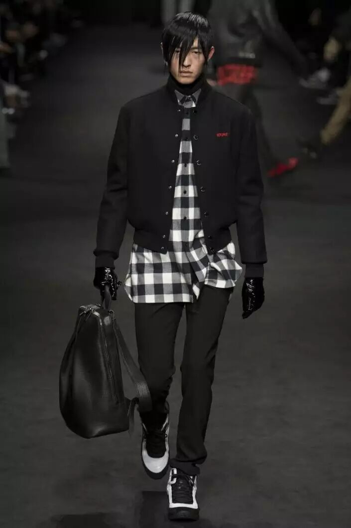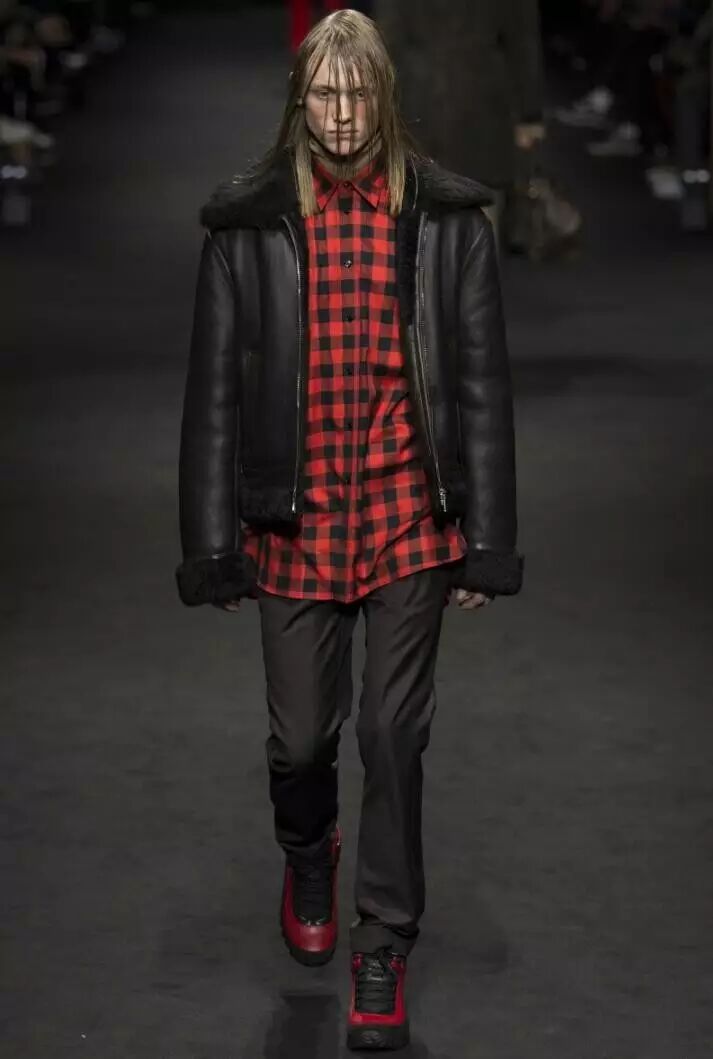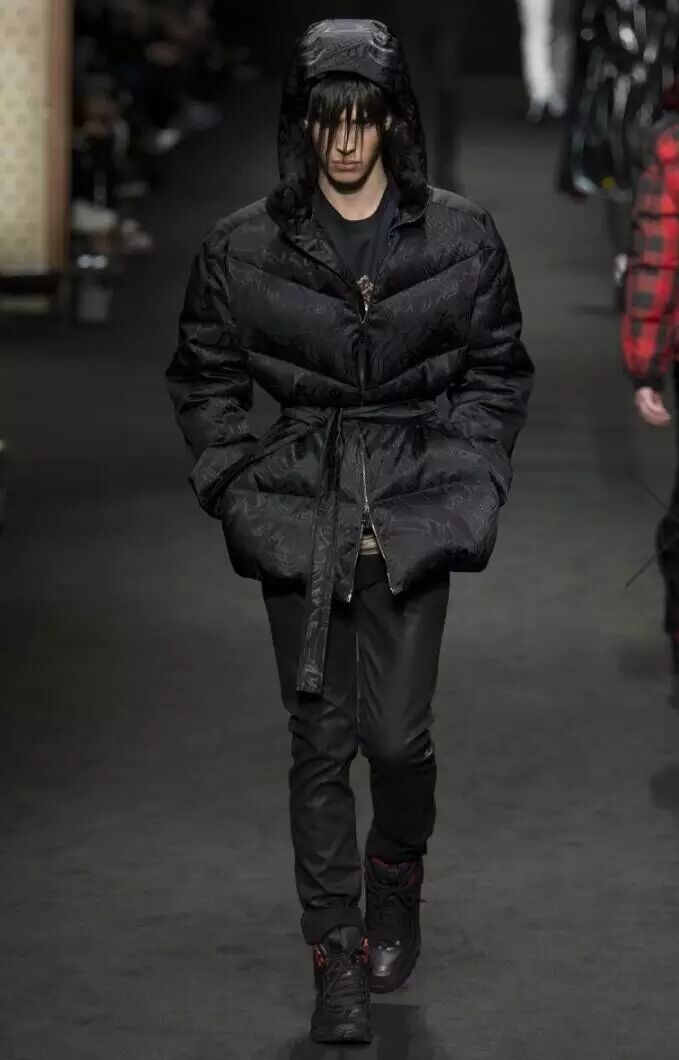 在Versace 2017秋冬男装系列的设计中,设计师将红与黑相撞,形成格纹的图案,应用到男装的衬衫、长款呢子外套、羽绒服等多种款式当中。