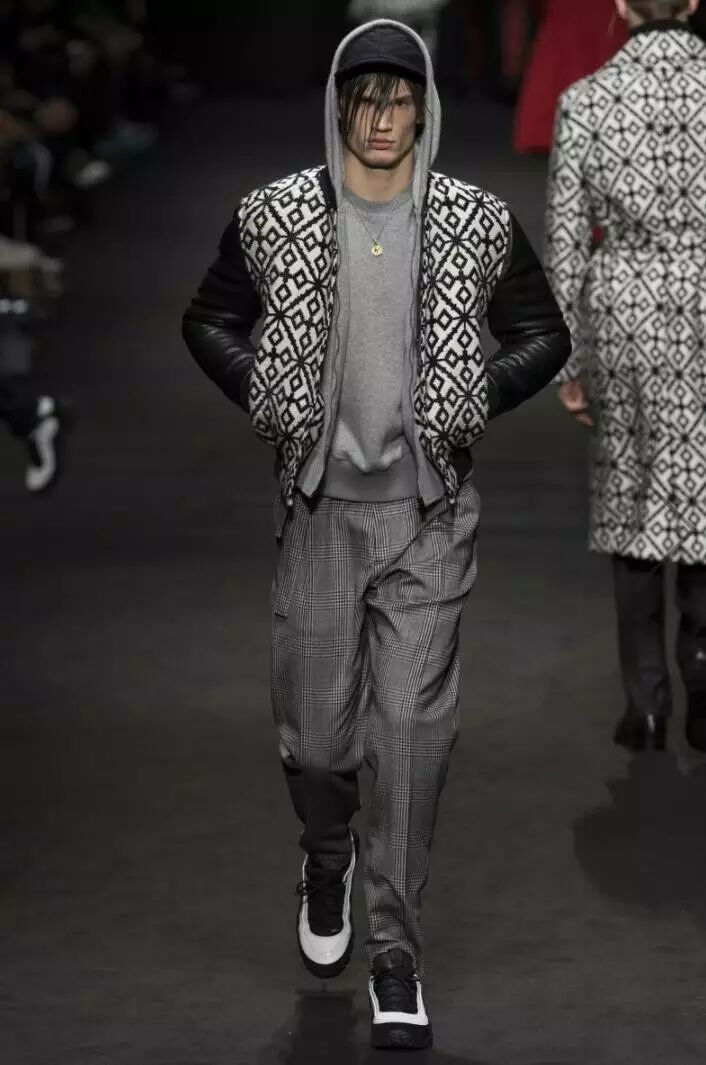 黑白灰三种无彩色系的搭配是色彩搭配中最常见的形式,Versace 2017秋冬男装系列中,涉及到了黑与白的撞色搭配和黑白灰的色彩搭配。