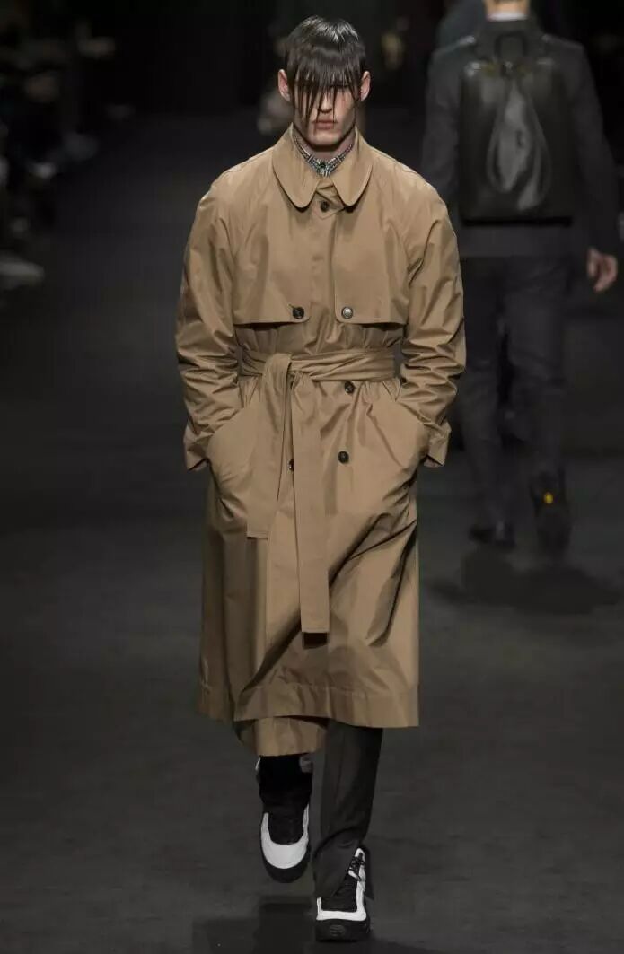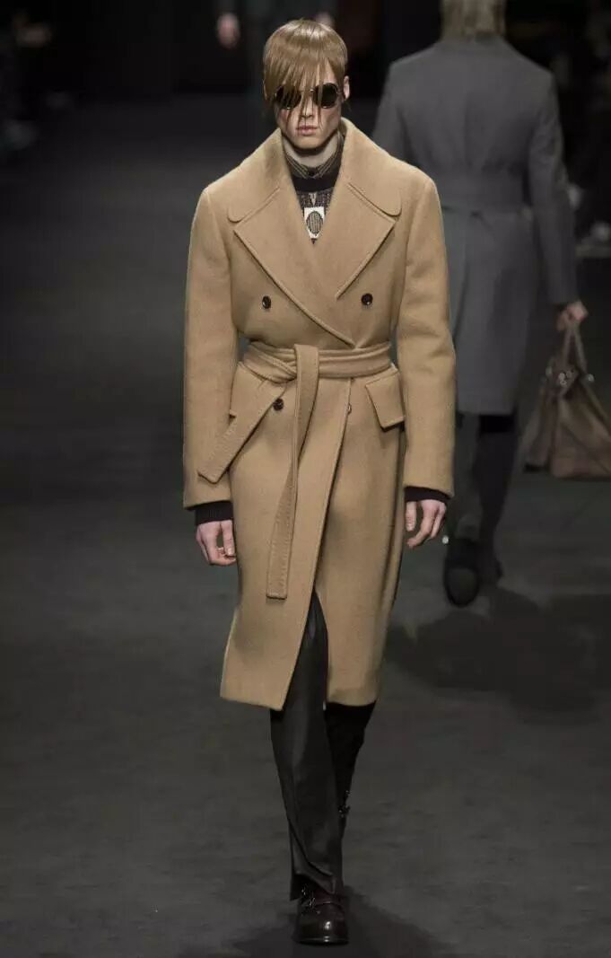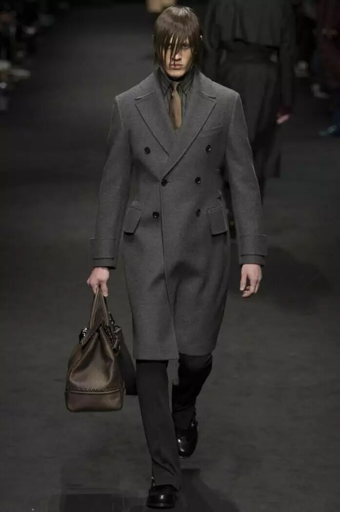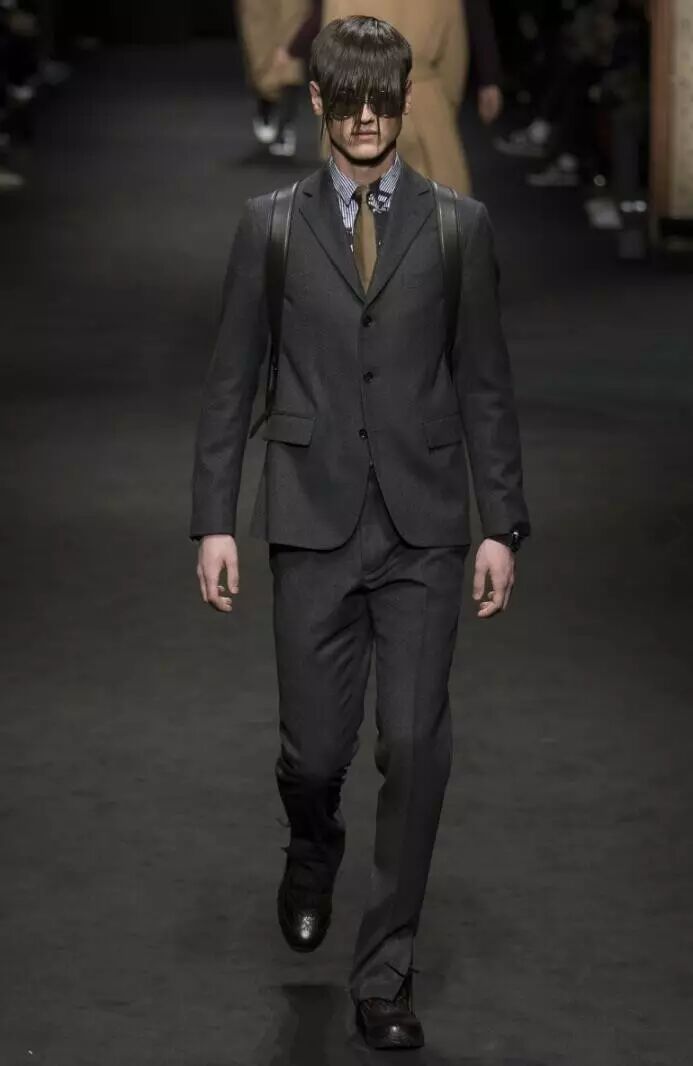 灰色系也是Versace 2017秋冬男装系列应用较多的色彩之一,主要为深灰和浅灰两种,在款式上,以套装和大衣来体现。如男装中的深灰色西服套装、深灰色大衣、浅灰色西服套装、浅灰色大衣等,这些服装款式设计简约,颇具绅士风。