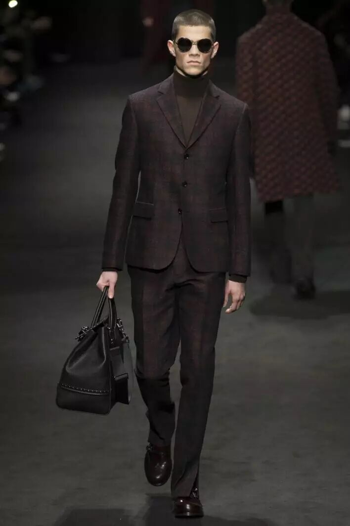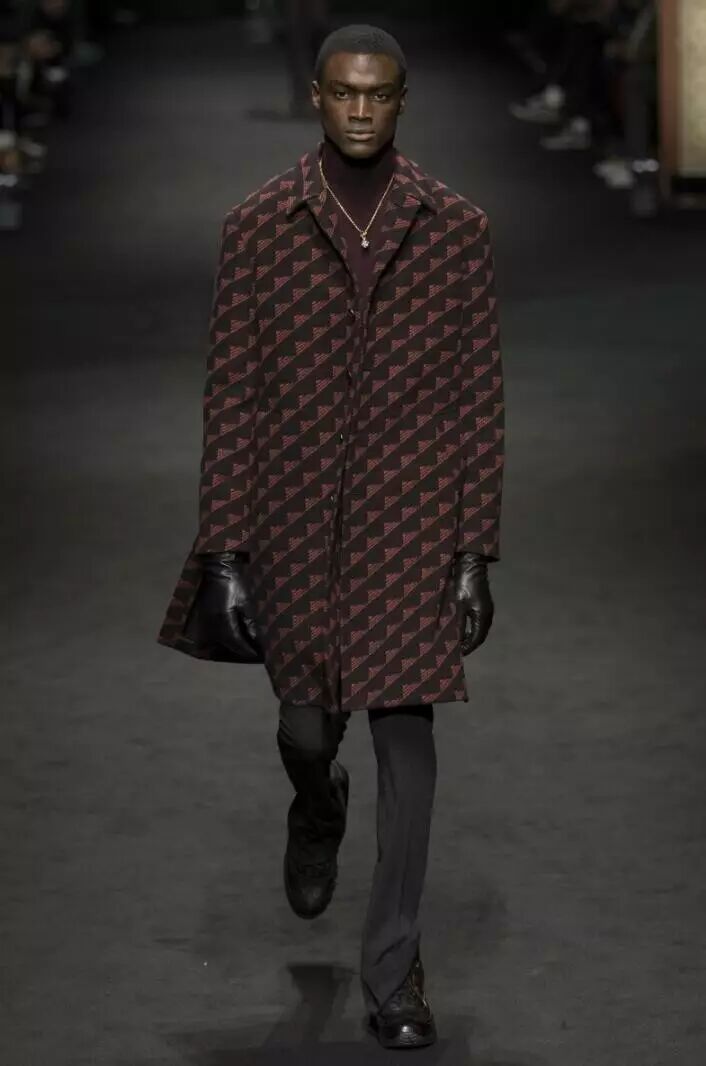 从秀场Look来看,暗红色以斜向三角纹和格纹两种形式被应用在大衣和西服套装的款式当中,而纯色无装饰的暗红色呢子大衣则设计简约,穿着舒适,颇具绅士风。