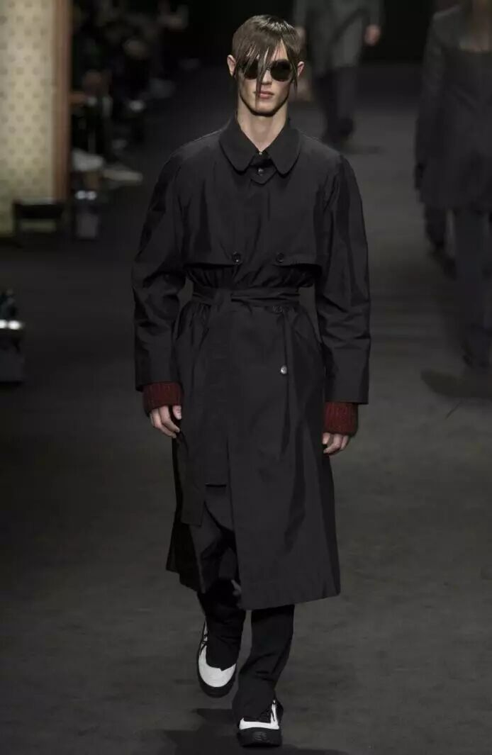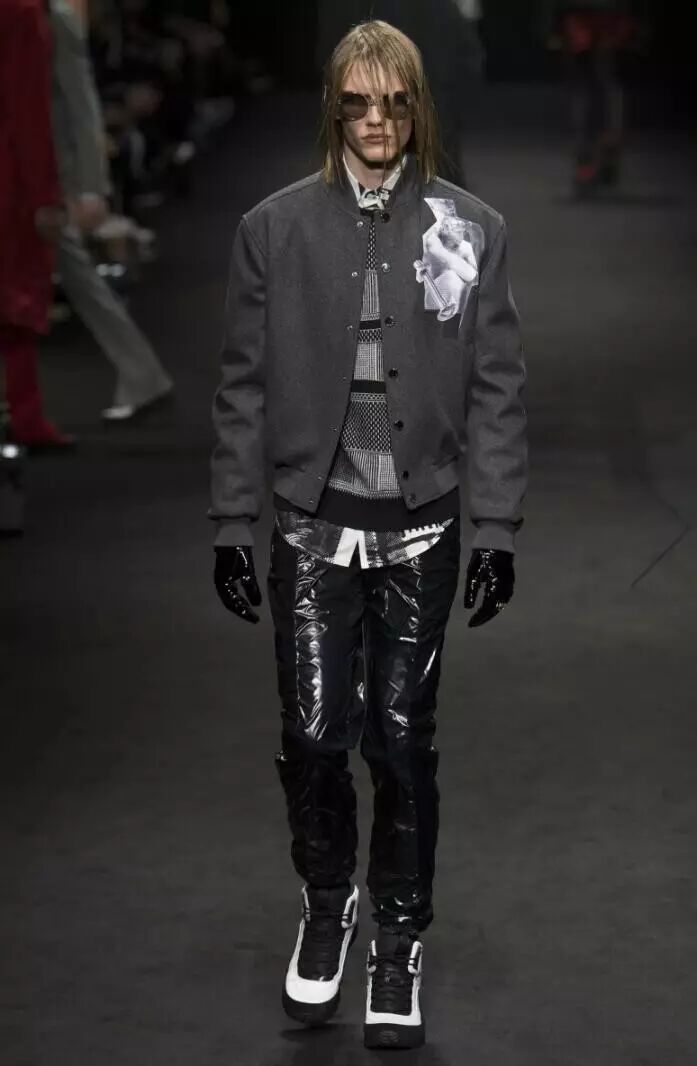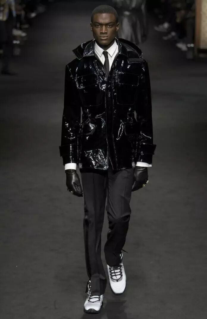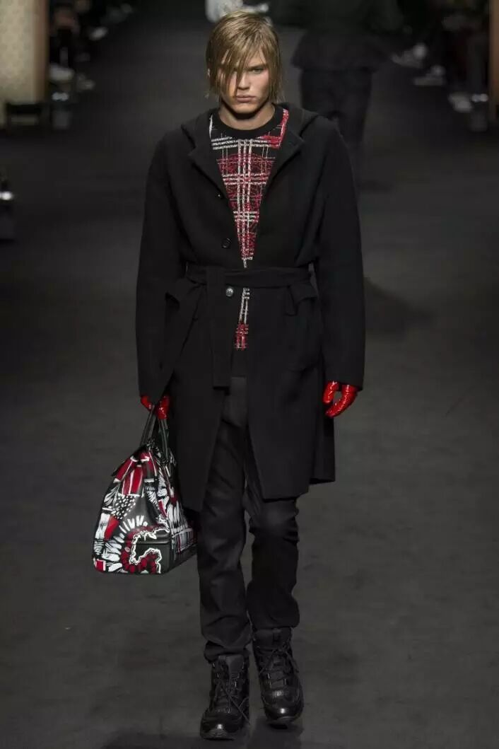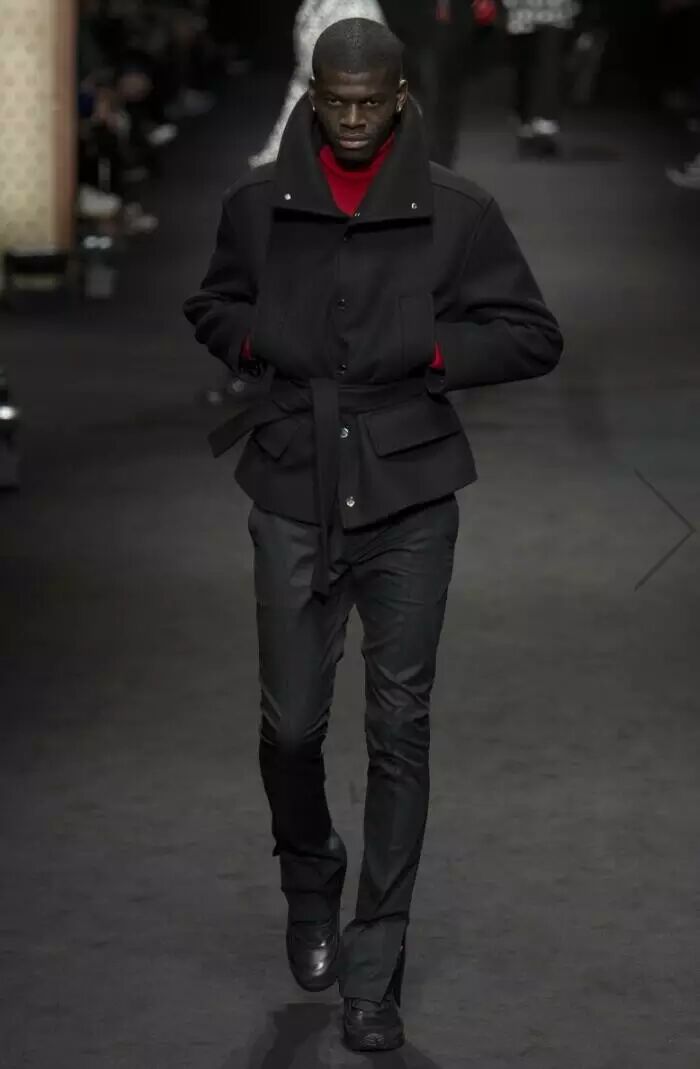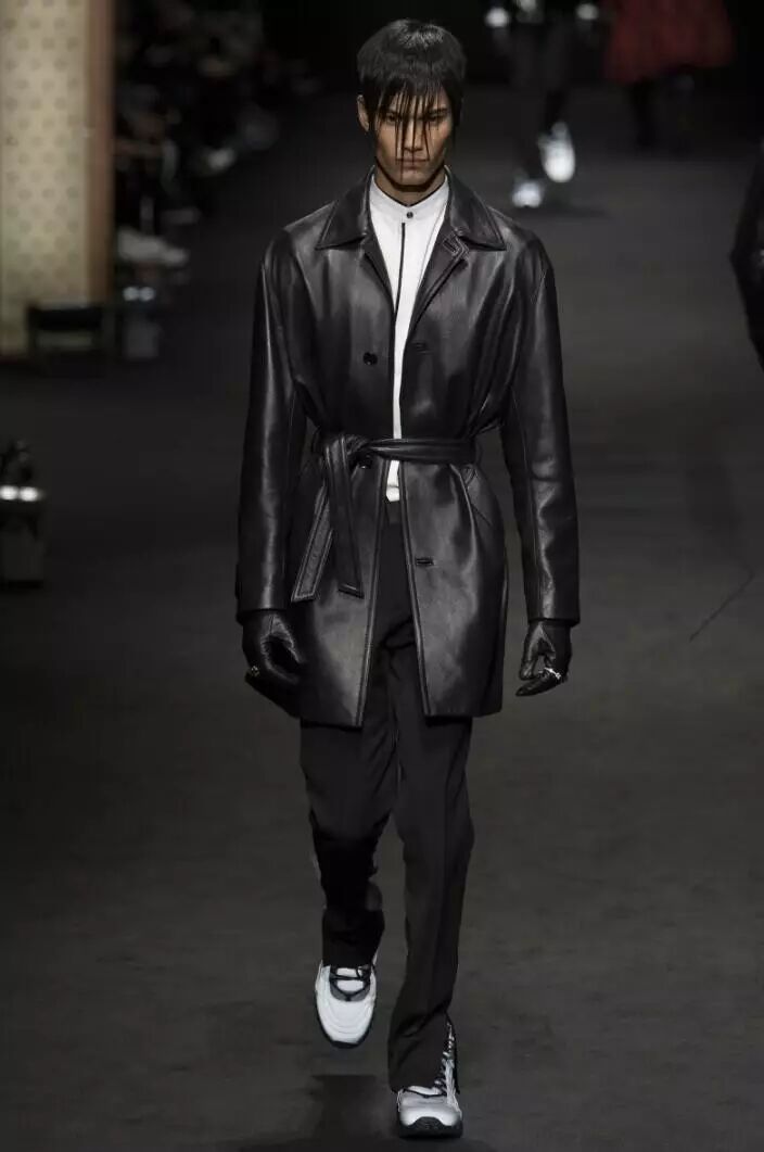 比灰色更深的暗黑色系,是Versace 2017秋冬男装系列的主色调。在这些应用到全黑的款式设计中,模特们演绎了一场暗黑色的盛宴,黑色系中局部点缀一点深红色,不同于红与黑的搭配,反而为设计中增添了一抹神秘的效果,犹如黑夜中的吸血鬼。