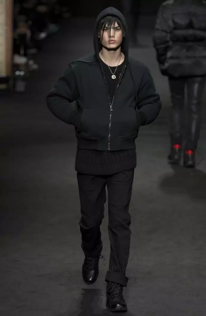 在款式的设计上,除了裤子的设计之外,黑色的外套、黑色夹克、黑色长款风衣、黑色羽绒服等款式均有,款型丰富,造型新颖,以暗黑的色彩演绎出模特冷酷的气质。