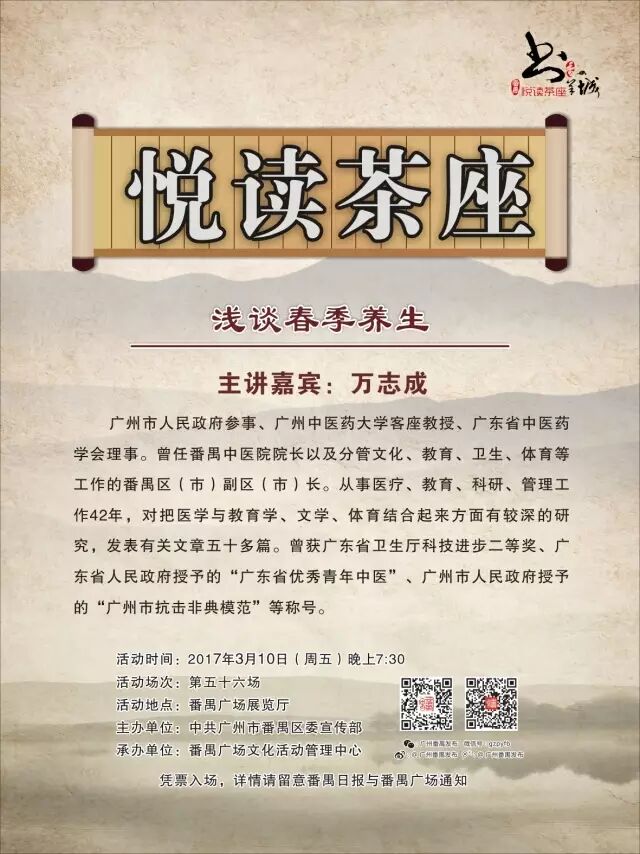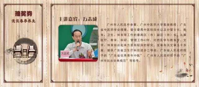,诚邀广州市人民政府参事、广州中医药大学客座教授万志成与大家分享春季养生知识。广州市人民政府参事、广州中医药大学客座教授、广东省中医药学会理事。曾任番禺中医院院长以及分管文化、教育、卫生、体育等工作的番禺区(市)副区(市)长。从事医疗、教育、科研、管理工作42年,对把医学与教育学、文学、体育结合起来方面有较深的研究,发表有关文章五十多篇。曾获广东省卫生厅科技进步二等奖、广东省人民政府授予的“广东省优秀青年中医”、广州市人民政府授予的“广州市抗击非典模范”等称号。