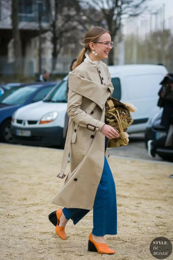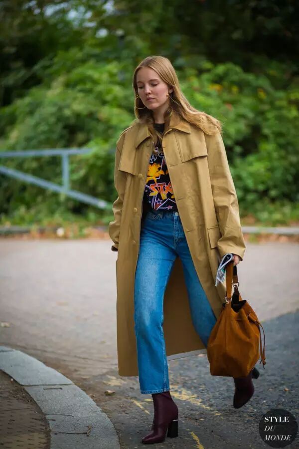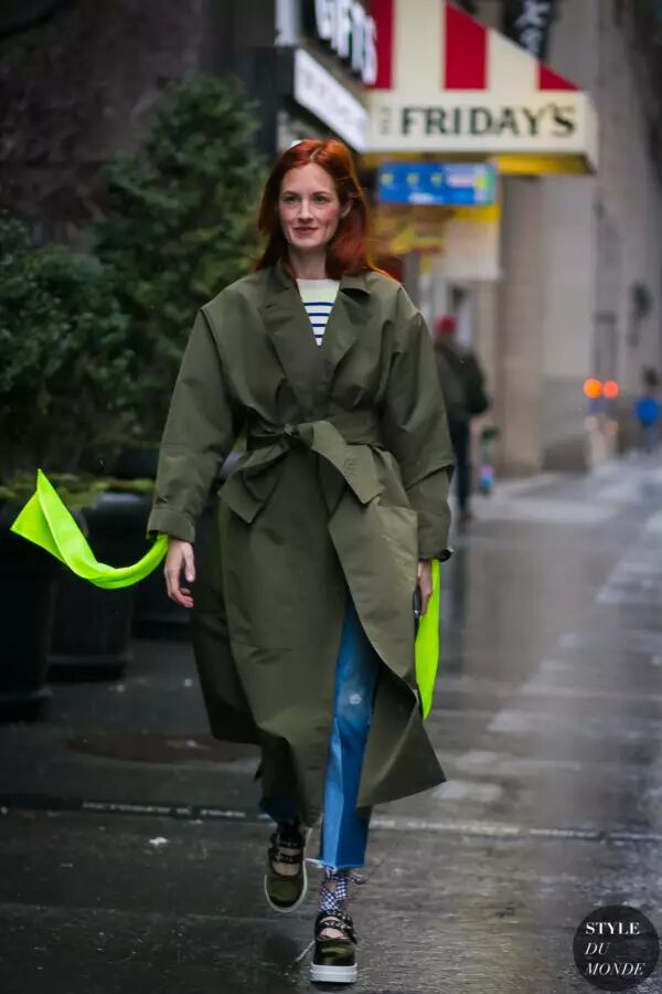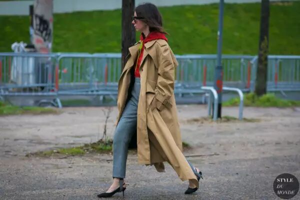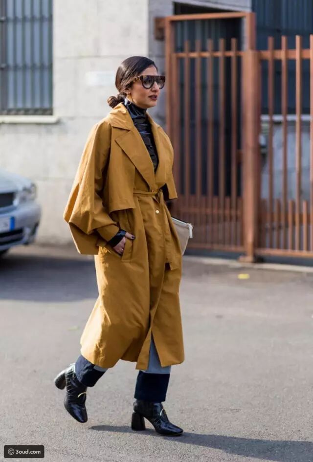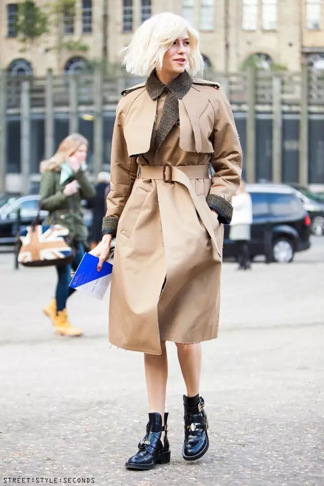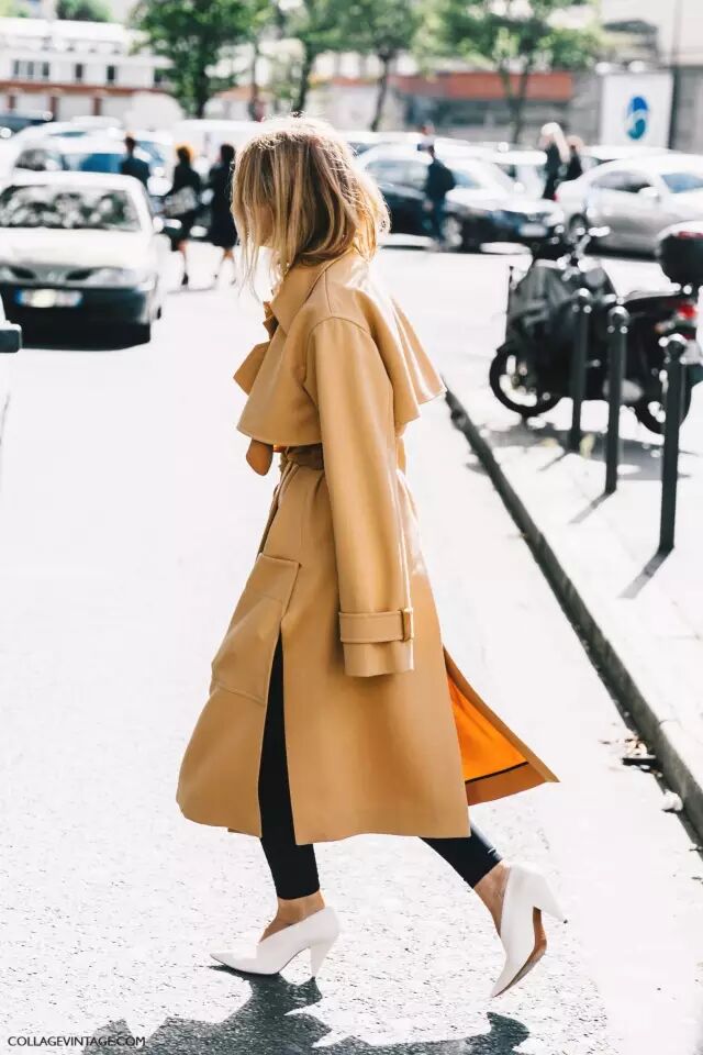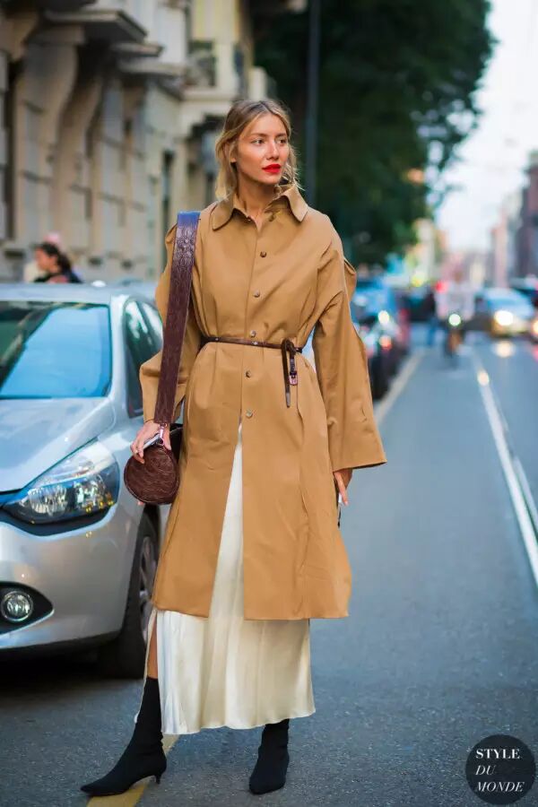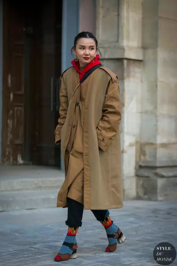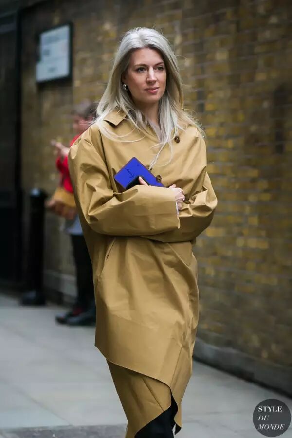 好在今年还特别流行oversized,风衣也是,今年特别流行oversized廓形风衣。大廓形有大气场,时装精们一般都用它搭配简单的裤装,慵懒又随性。搭配时要牢记上松下紧的原则。但是它对娇小的妹扎不怎么友好。但个子高瘦的人,穿起来还是蛮有气场的。