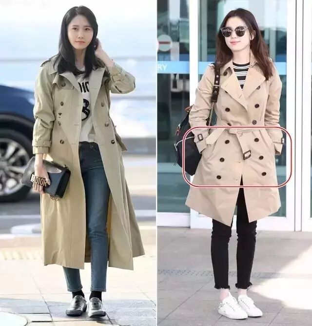 黄皮星人如果想选卡其色的风衣,最好选颜色浅一点、饱和度低一点的,穿起来会更有精神。对比一下,右边这件更适合黄皮。