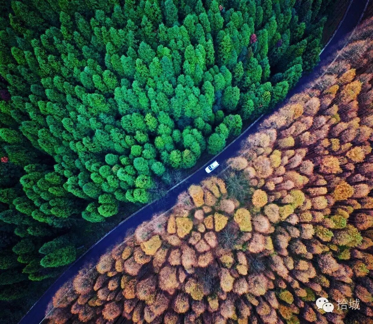 重庆-2016年11月30日,汽车从“泾渭分明”的森林道路上经过。因为树种不同,这里每到冬季就会出现“一半是火焰一半是海水”的景观。 拾城 崔力
