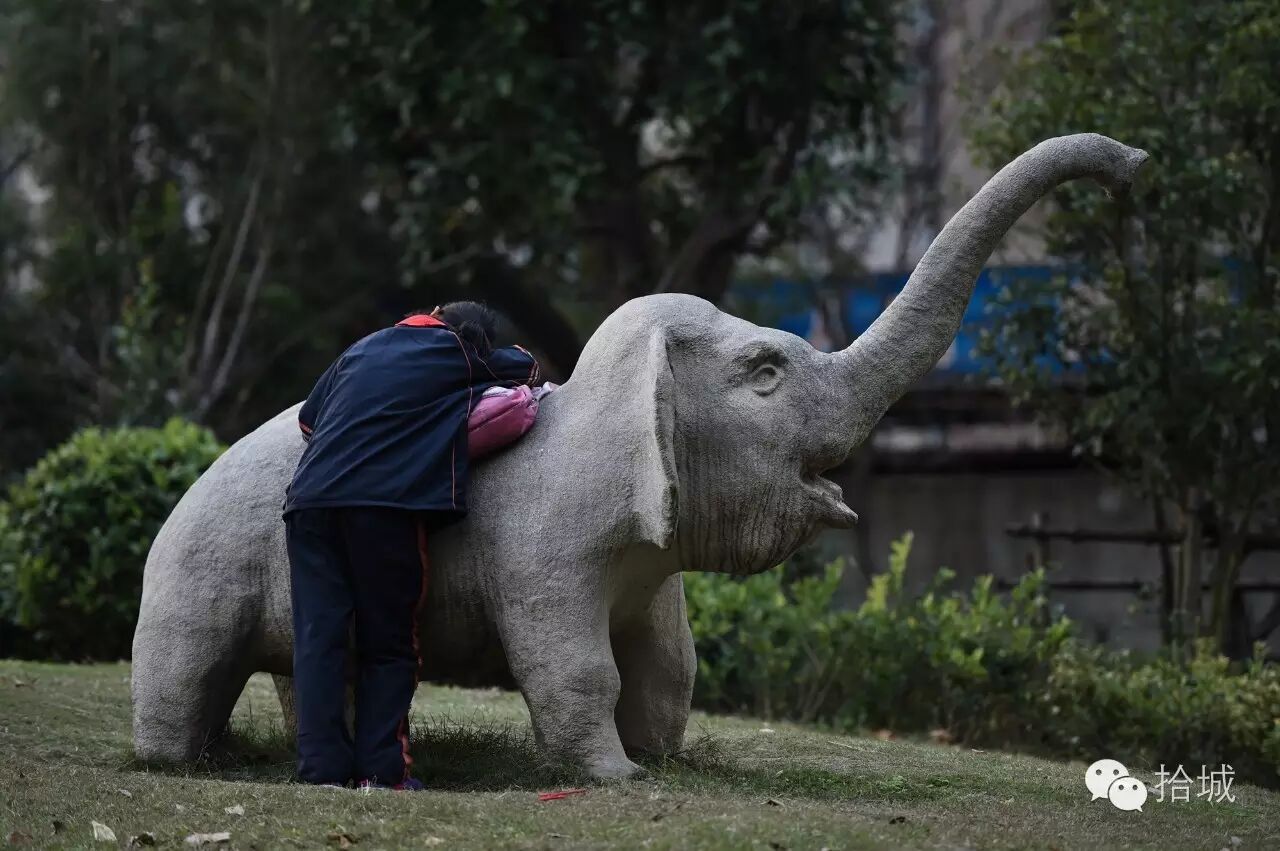 嘉兴-2016年11月30日,放学途中,一名女孩趴在一座小象雕塑上休息。 拾城 朱骏