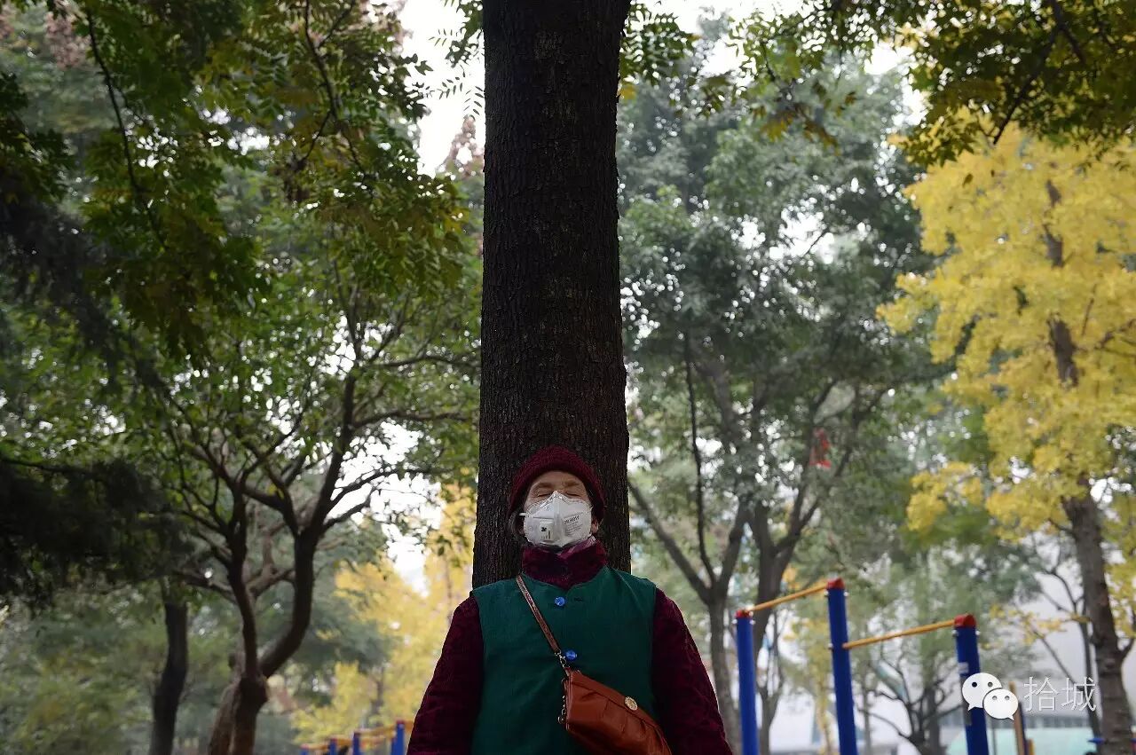 成都-2016年12月2日,雾霾天,一位戴着防霾口罩的老人闭着眼睛,用背部撞击树干,以此锻炼身体。 拾城 王效