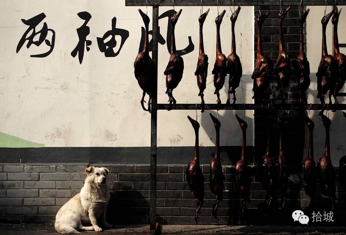 2016年12月2日上午,杭州一菜市场的小弄里,一条小狗在看护主人晒着的酱鸭。 图虫 品水