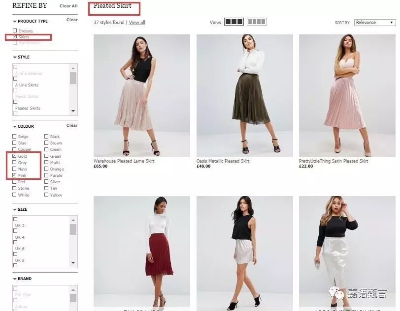比方说,我前段时间买了条香槟粉的百褶半裙。因为很少穿粉色,这件衣服买回家后我一时毫无头绪应该搭配什么上装。于是我就上ASOS网站直接搜索“百褶半裙(Pleated Skirt)”