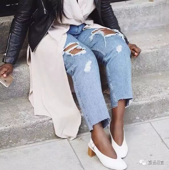 但说实话,并不是所有的搭配你不动脑筋照搬都会好看。比方说上面这个女生搭配的这双绑带高跟鞋,我就觉得有些累赘。我觉得还是换成细带高跟比较简约。