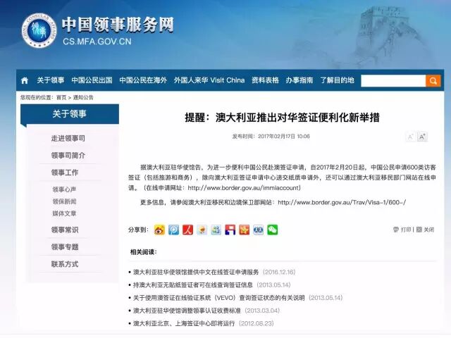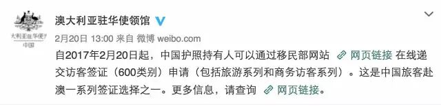 据澳大利亚驻华使馆通告称,为进一步便利中国公民赴澳签证申请,自2017年2月20日起,中国公民申请600类访客签证(旅游签证),除向澳大利亚签证申请中心递交纸质申请外,还可以通过澳大利亚移民部门网站在线申请,更加便捷!