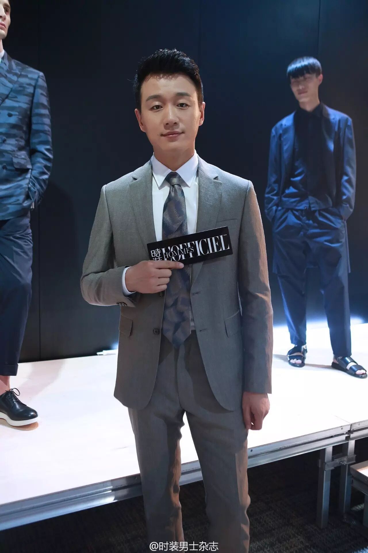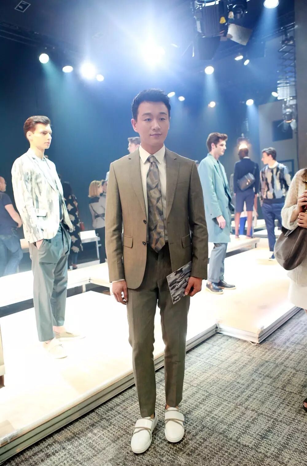 西装革履的佟大为现身 CERRUTI 1881 2017 春夏秀场,灰色西服套装搭配同色系花色领带素净清雅,白色休闲鞋使整套 Look 看起来更加舒适自如。