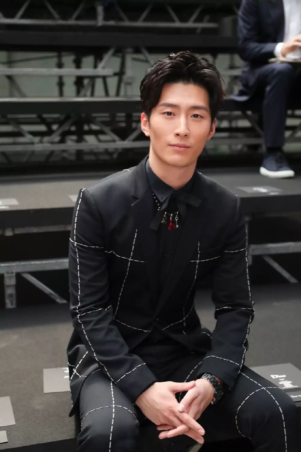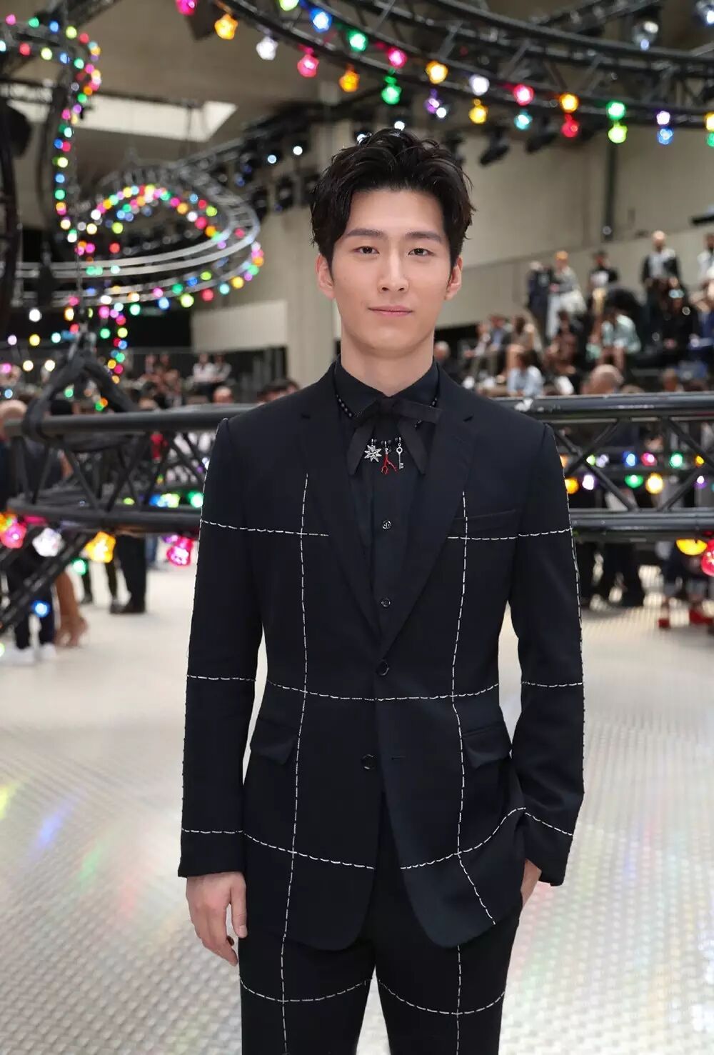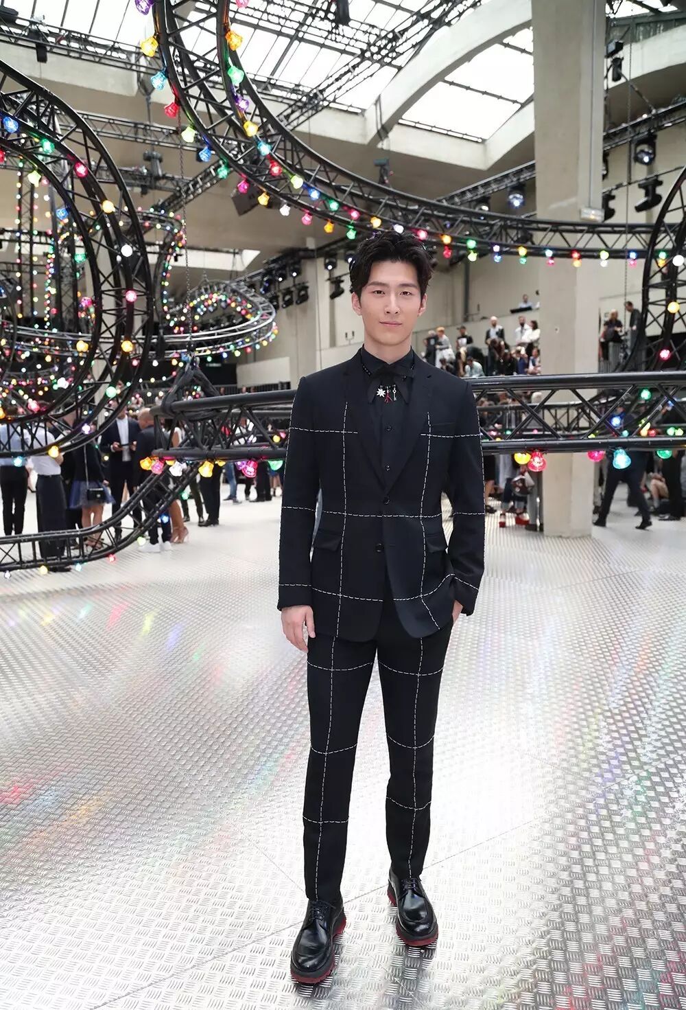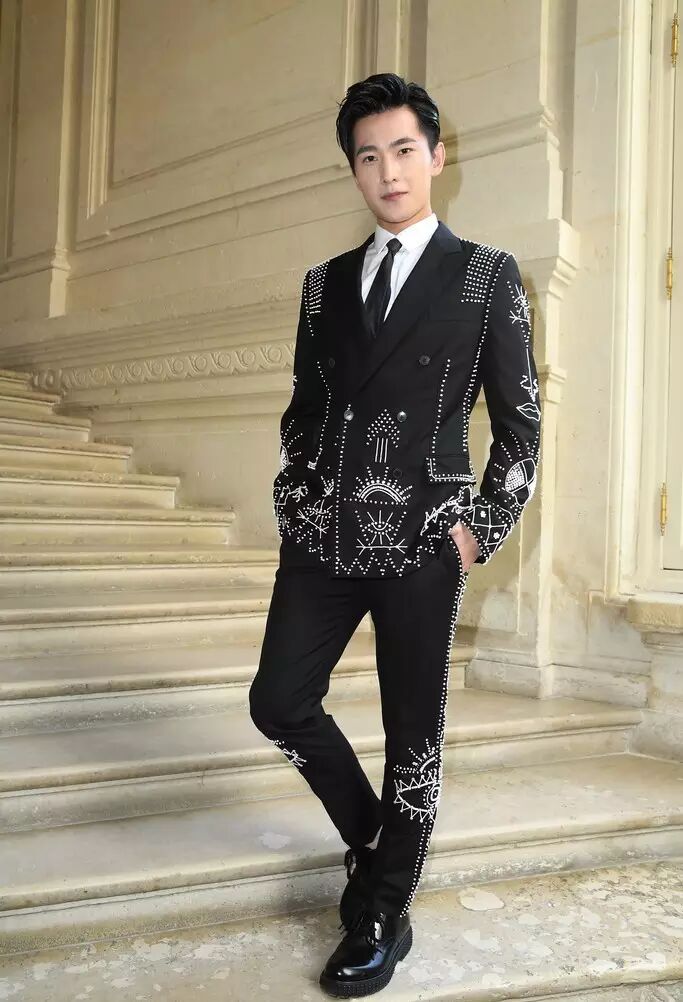 演员窦骁帅气亮相巴黎 Dior Homme 2017 春夏秀场。西装上用手工缝缀的细金属链条格纹,个性摩登。别致的领针隐约闪着星光,红色的小装饰和红色鞋底边遥相呼应,俏皮可爱。