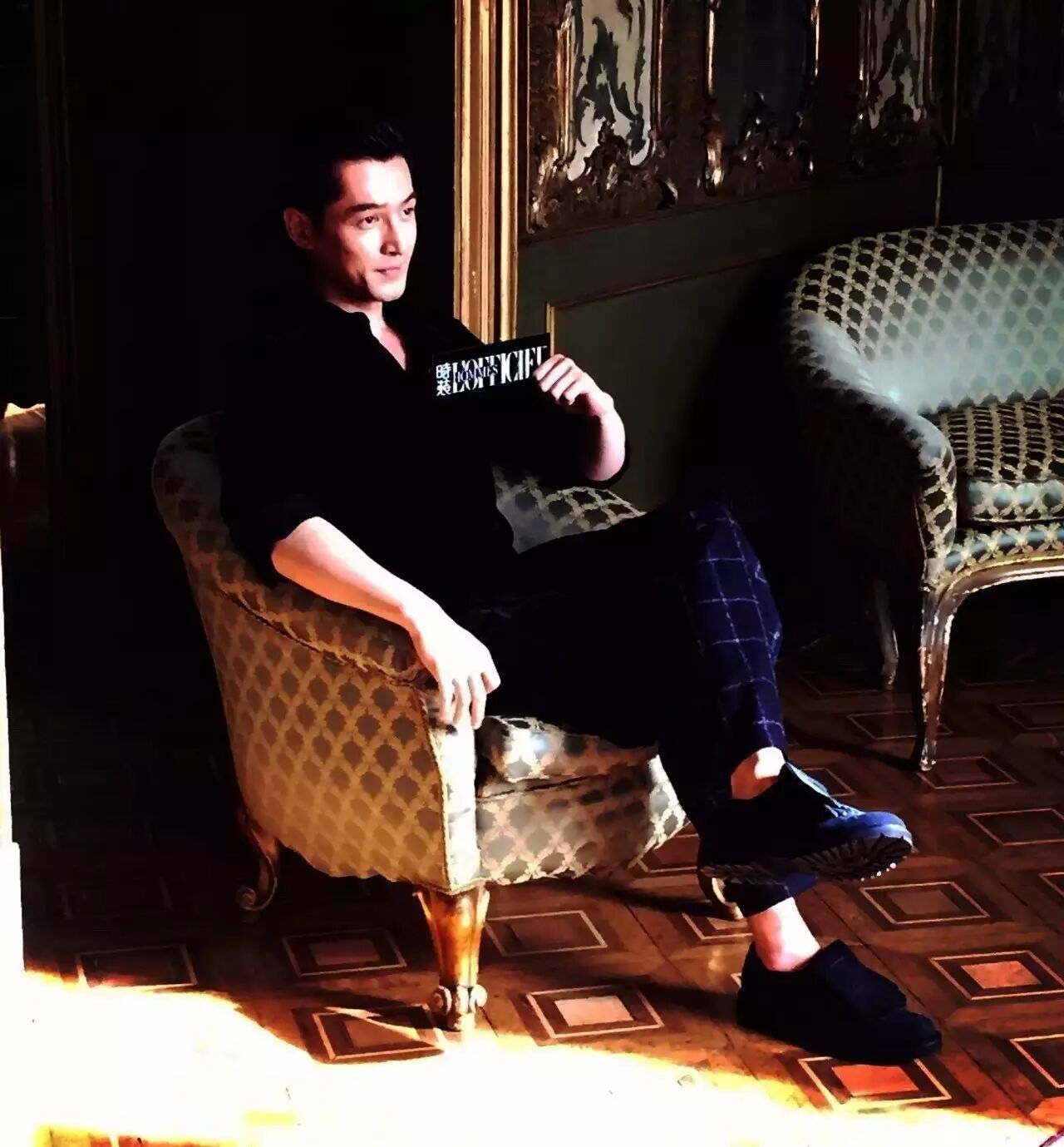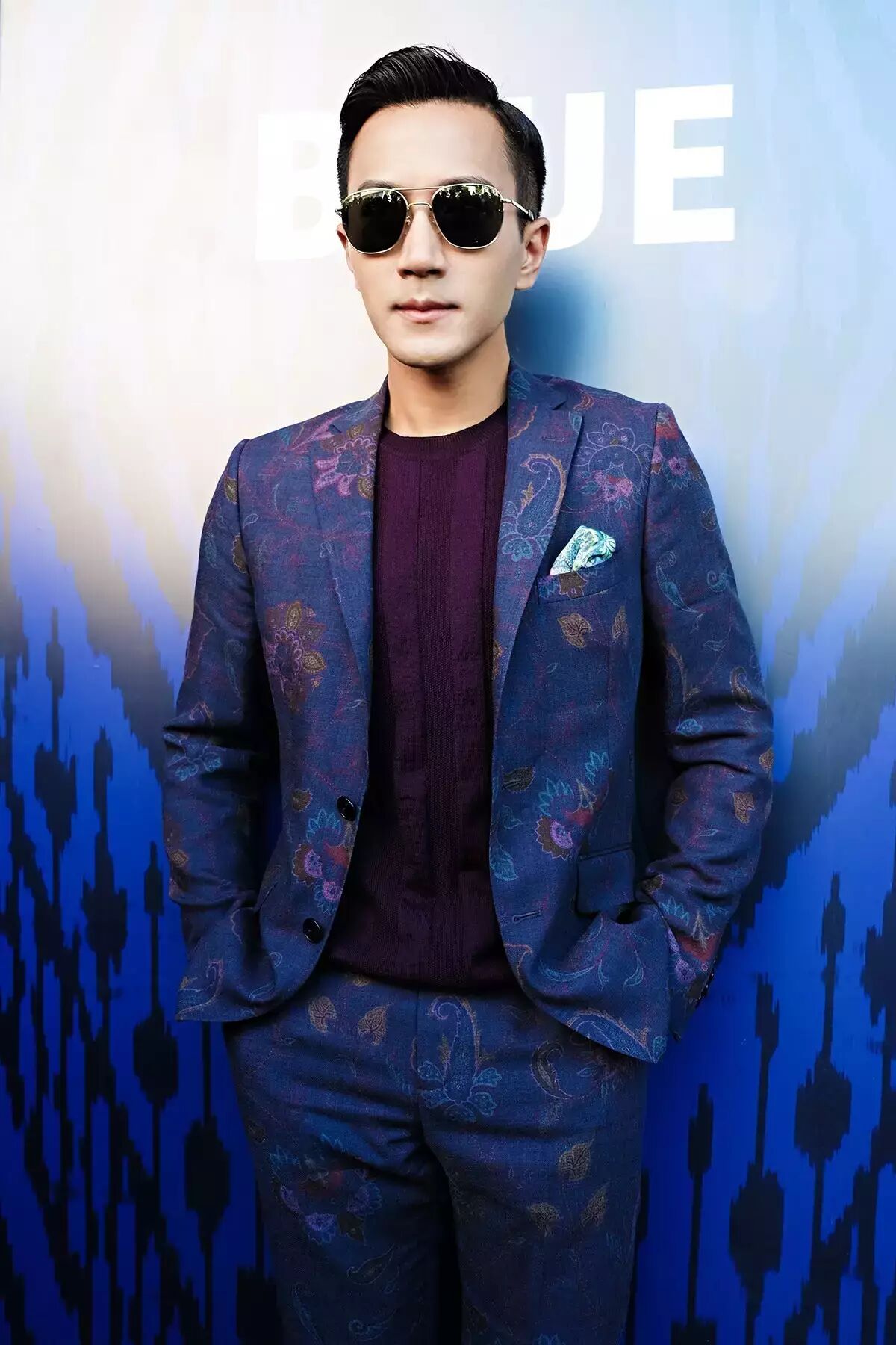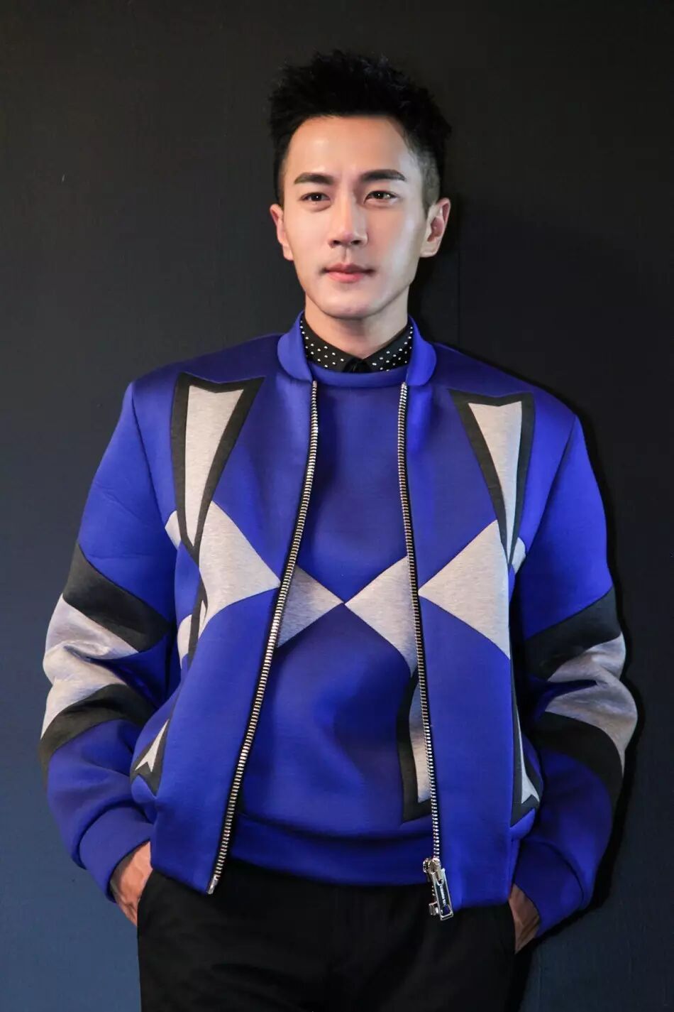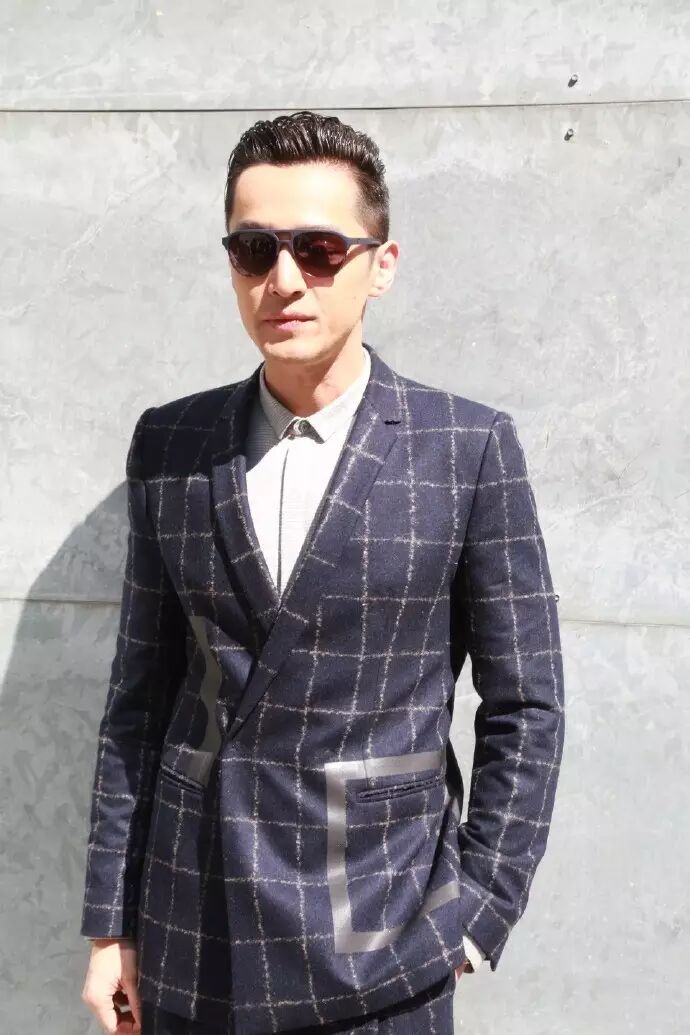 Tips:衣着和颜色的选择上很是忠于自己的风格,而宽大的蓝色袖沿则一扫沉闷。就算是年轻帅哥,也可以偶尔选择带有中式设计的衣着,如果搭配的好,会有完全不一样的气质。
