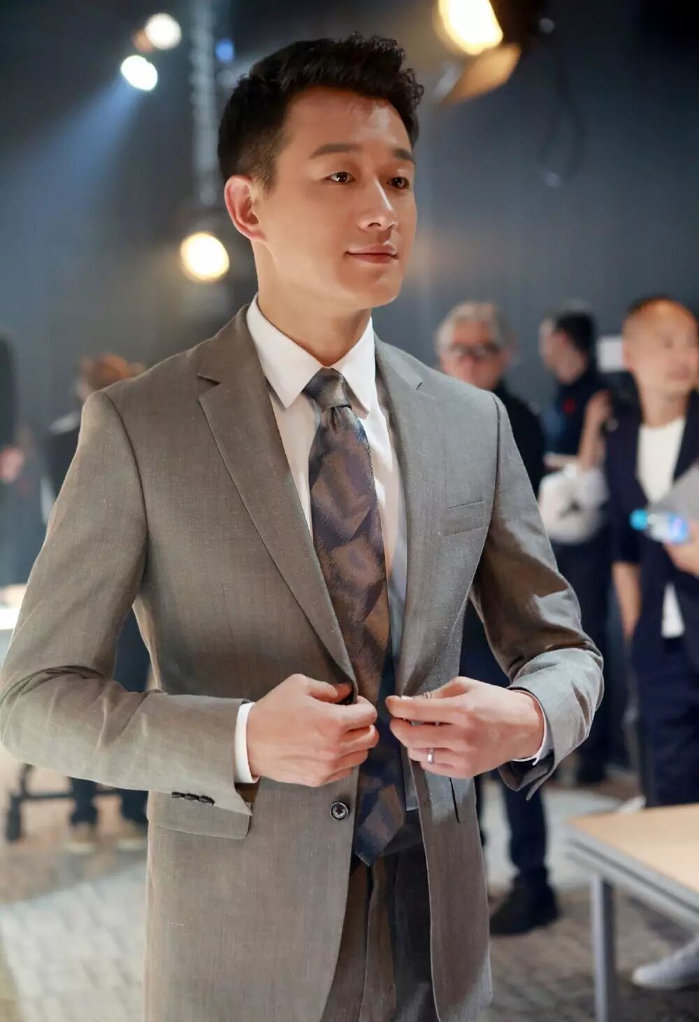 Tips:搭配精致感的细小波点,张若筠的细领带非常搭衬,选的很好。提示一下各位男士,即使你穿着很简单且基本款的衬衫西裤,即使是一身黑灰蓝都没关系,只要剪裁到位、尺寸合身,而且裤腿和领口、袖口等所有细节熨烫平整,也会使得整体看起来就够高分。因为对于男士来说,邋遢不合身的衣服远远比没创意更可怕。