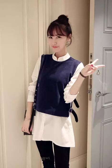 很好看的假两件,不用刻意去搭配,一件搞定,上身效果超级棒,也是百搭单品哦,果断自留款,不管是单穿还是打底都非常的好看的哦!随意搭配短裤短裙和小脚裤就可以美美的出门了!衣服是藏青色的哦,学院风的颜色很棒!